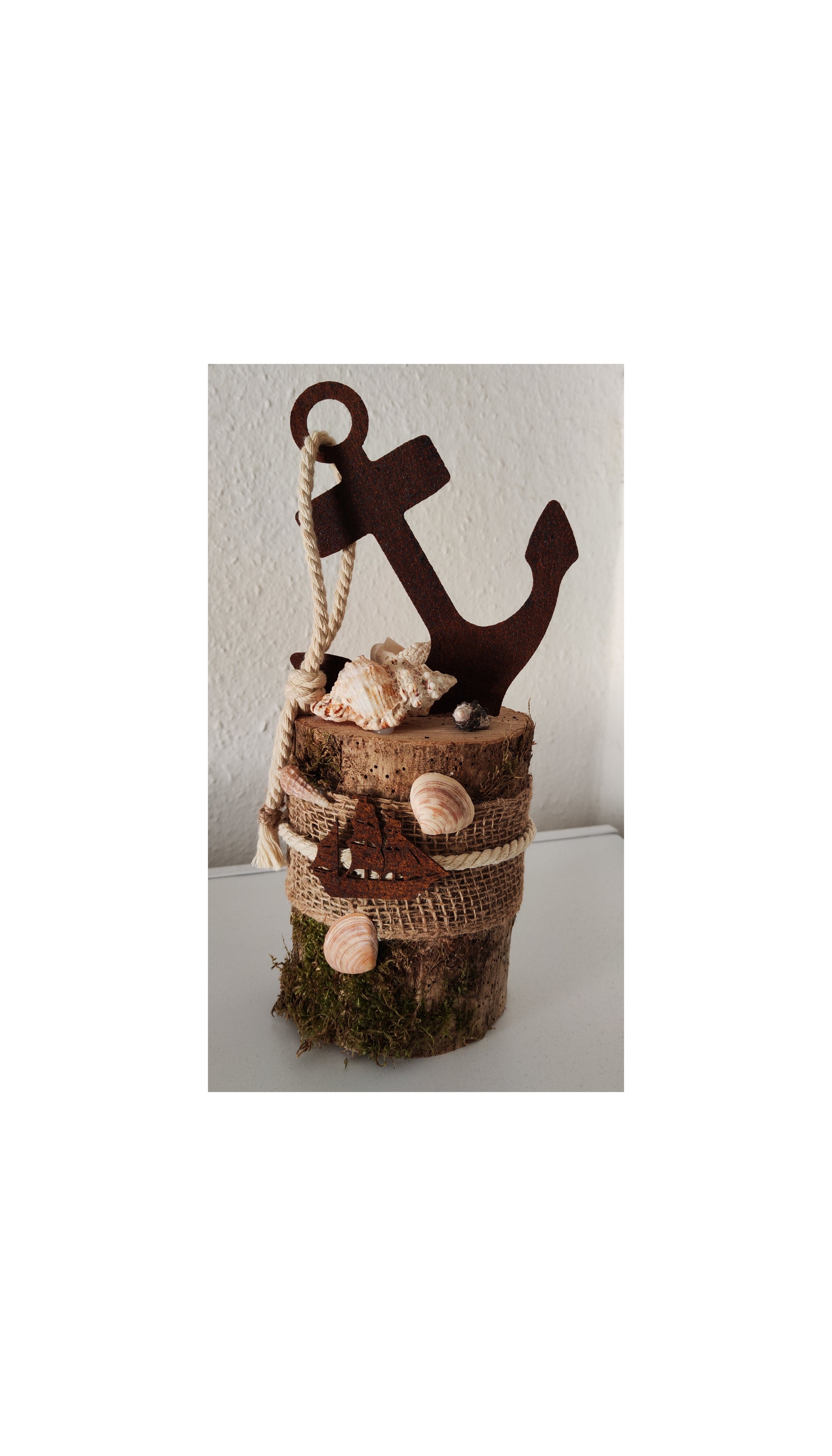 Schöner Anker im Maritim Style und kleines Schiff aus Metall, edelverrostet, mit Muscheln, Jute und Seil auf Naturbaumstamm dekoriert. Da er Wetter,- und Wasserfest ist auch für das Badezimmer oder im Außenbereich, Garten oder Terrasse als Dekoration geeignet. Größe: H 32cm x B 12,5cm x T 10cm.