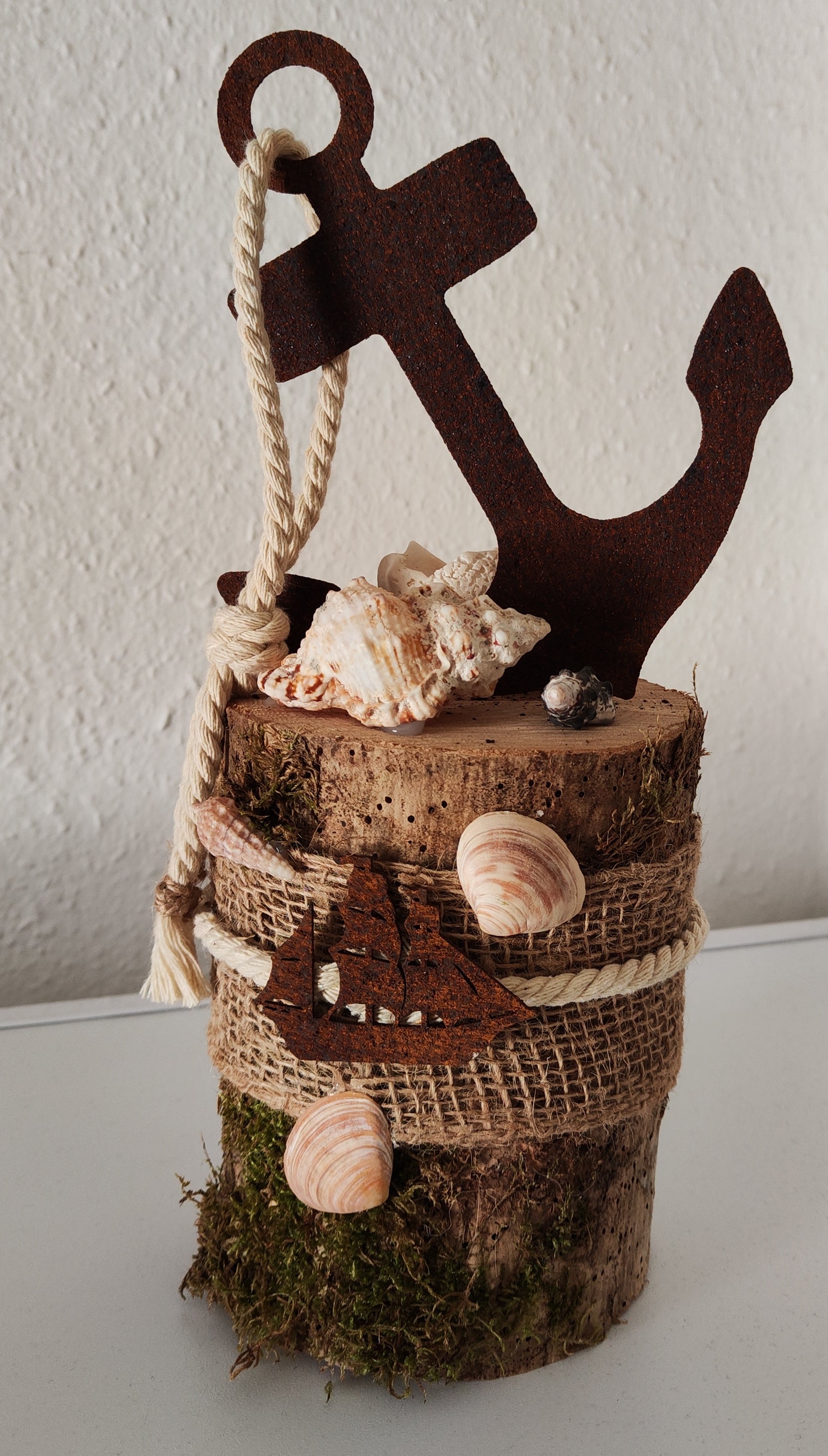 Anker in Rostoptik auf Naturholzstamm, maritim dekoriert