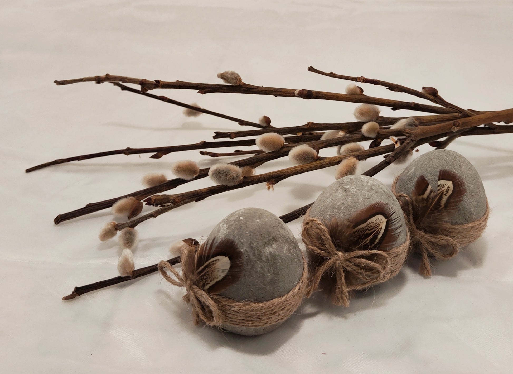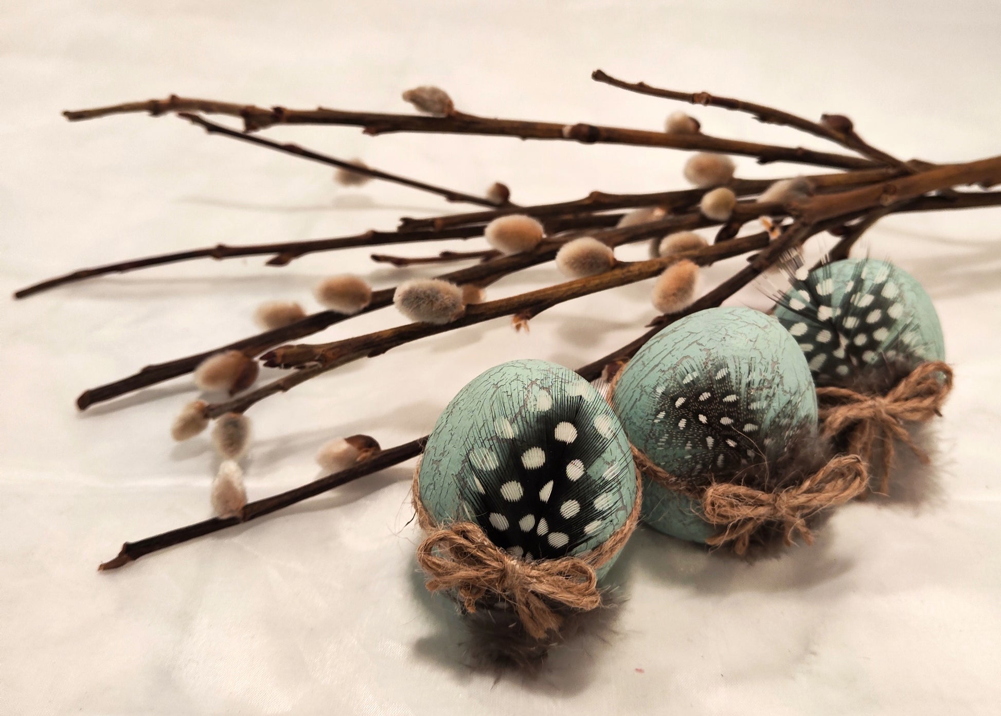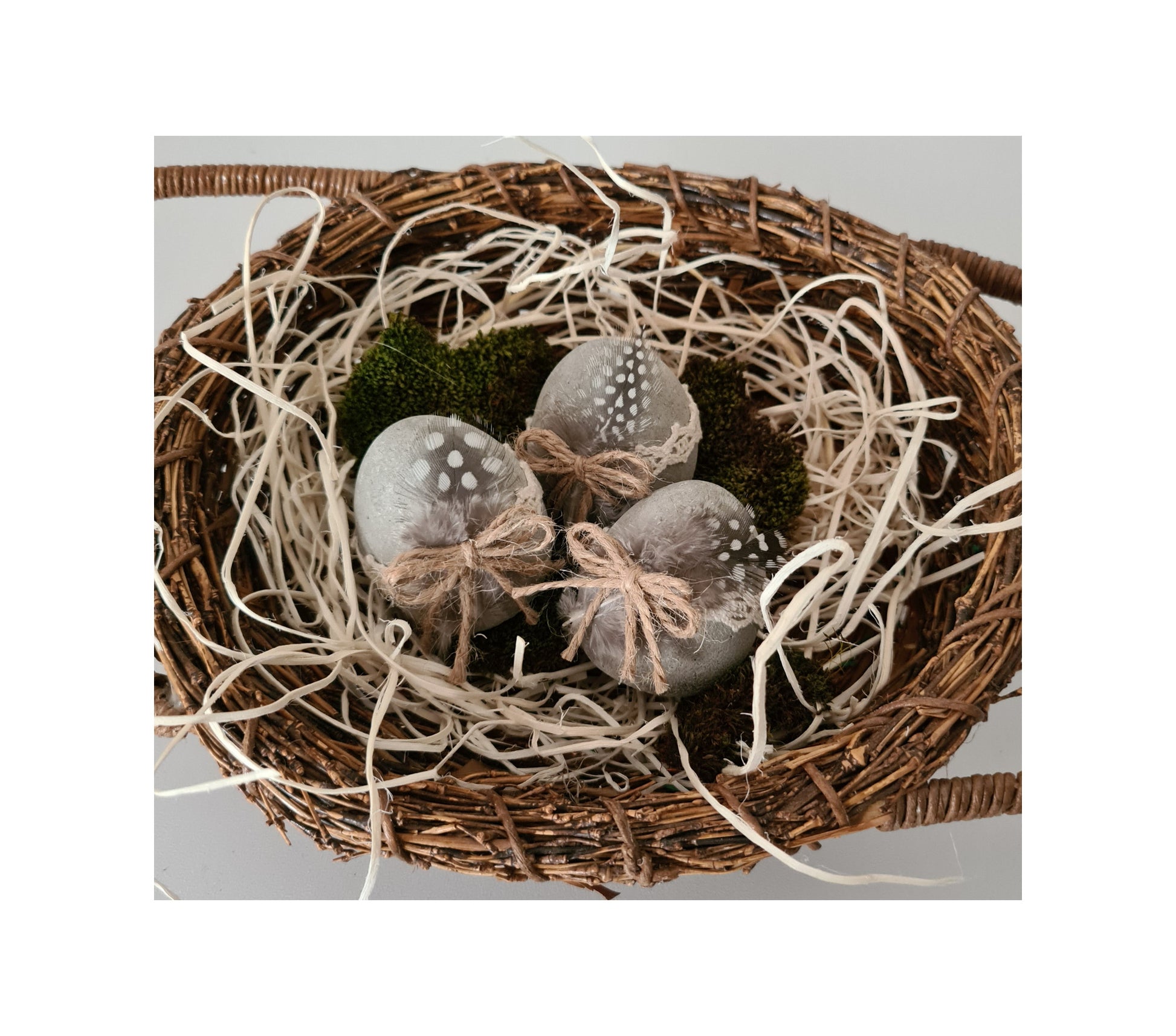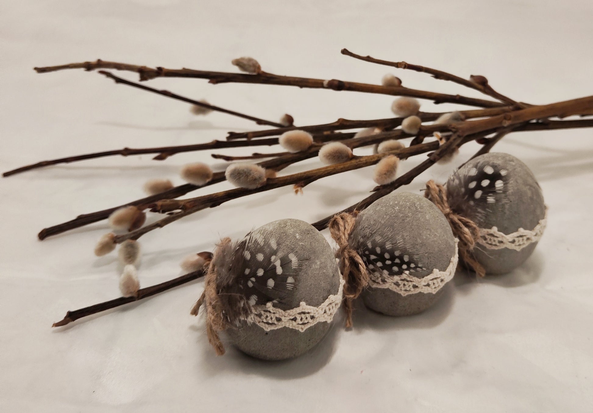 Schöne Betoneier im 3er-Set. Verziert mit Federn, Juteband oder Spitze. Manche sind bemalt und Crakeliert.