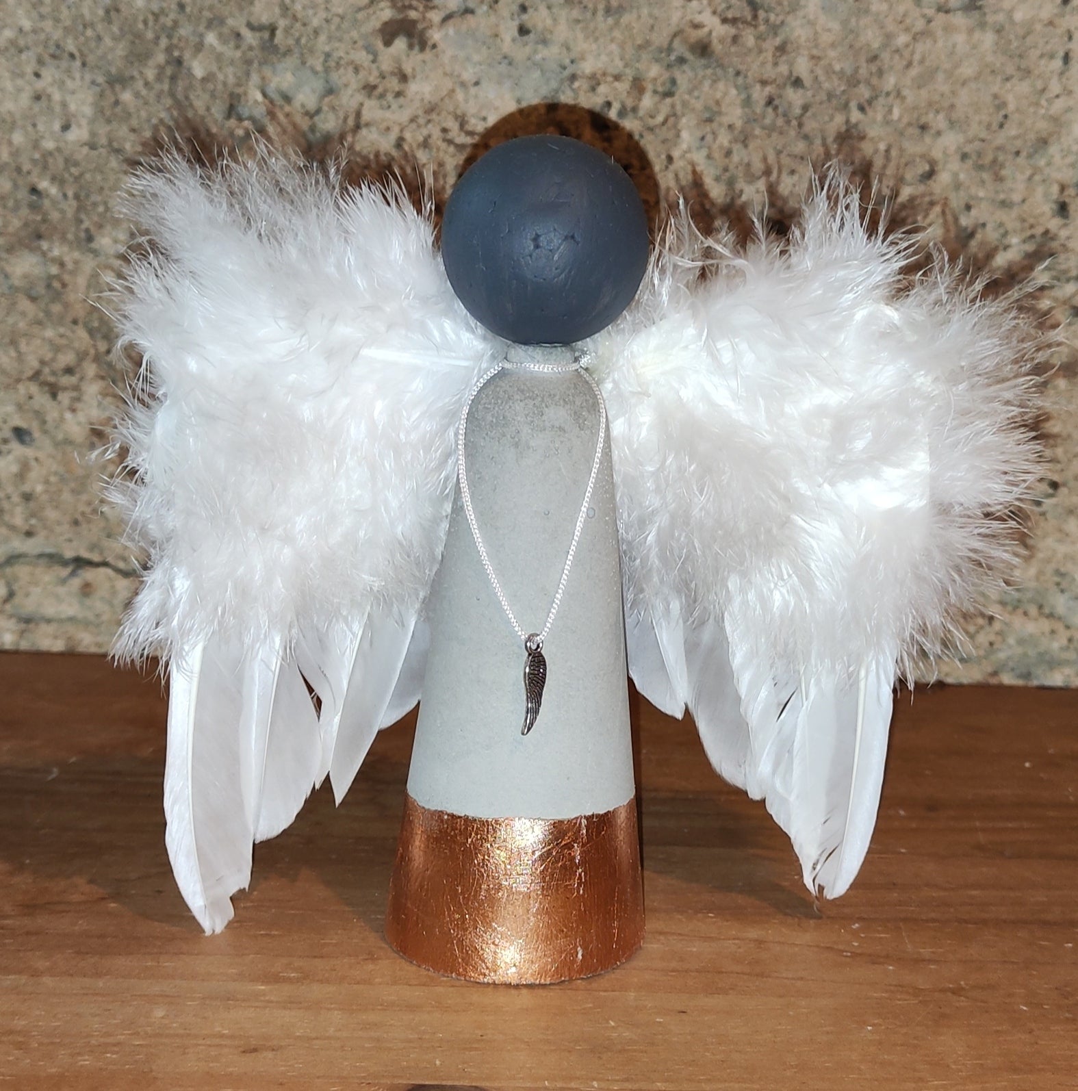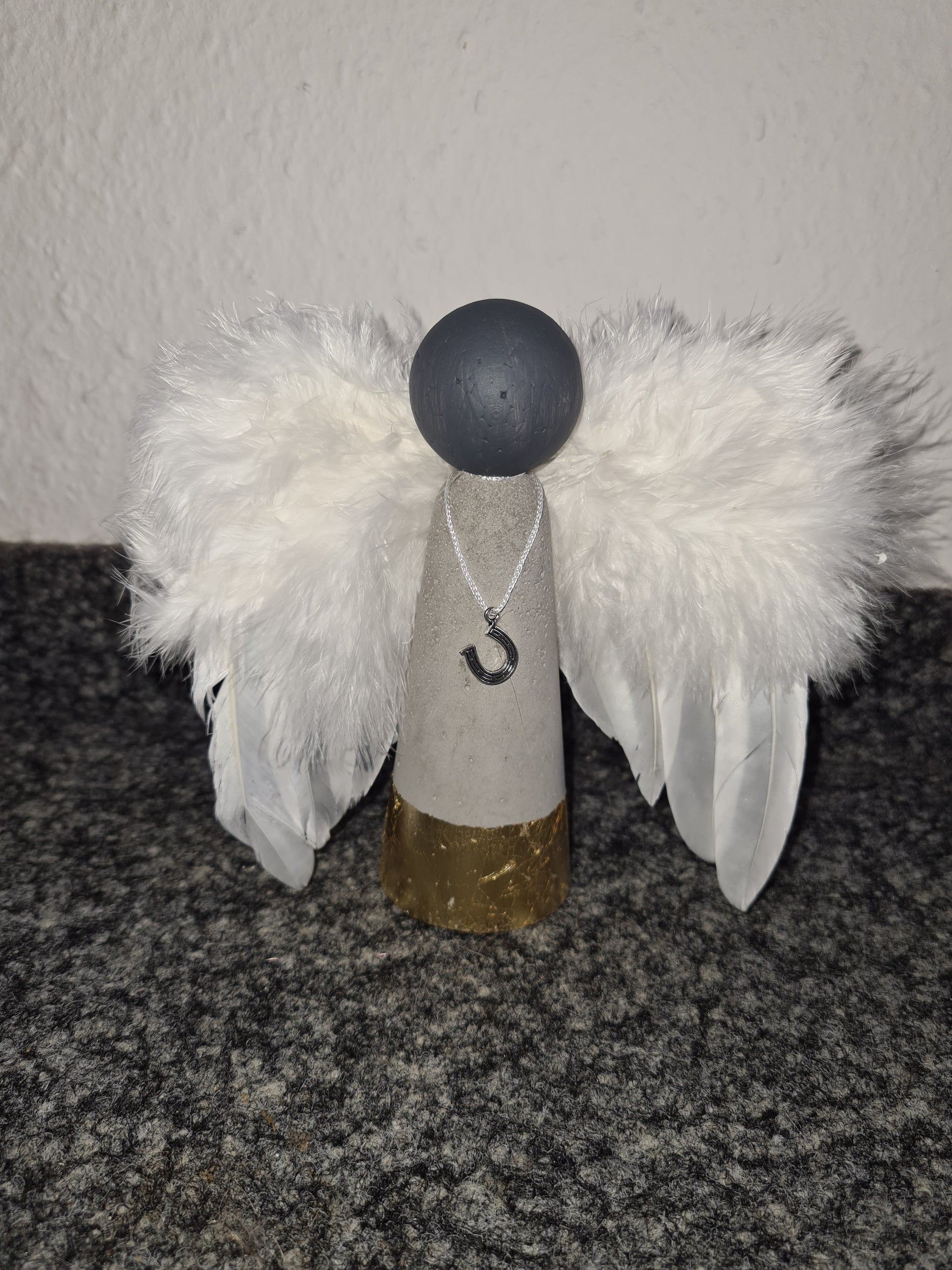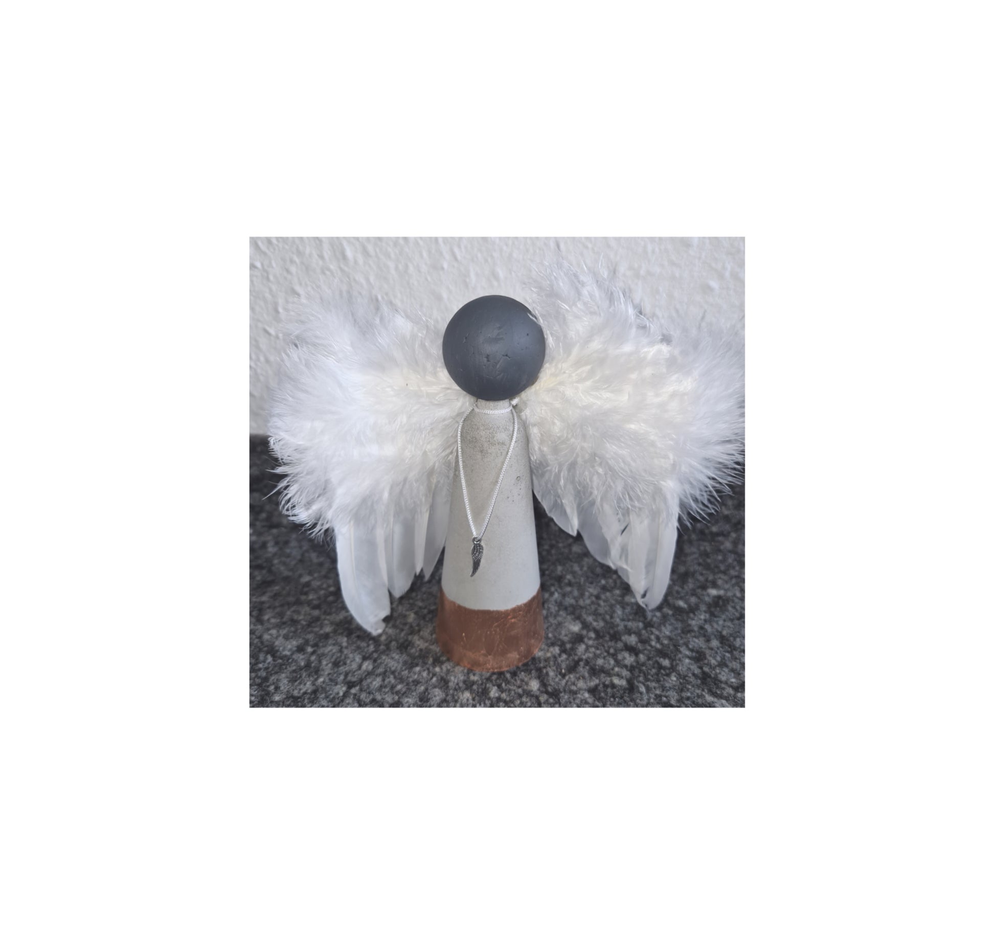 Liebevolle von Hand gegossene Beton-Engel mit kleinem Anhänger. Der Fuss ist mit Imitatblattgold bearbeitet, Der Kopf eine lackierte Styroporkugel. Die Flügel aus weißen Federn. Größe: H 15cm x B 15cm.