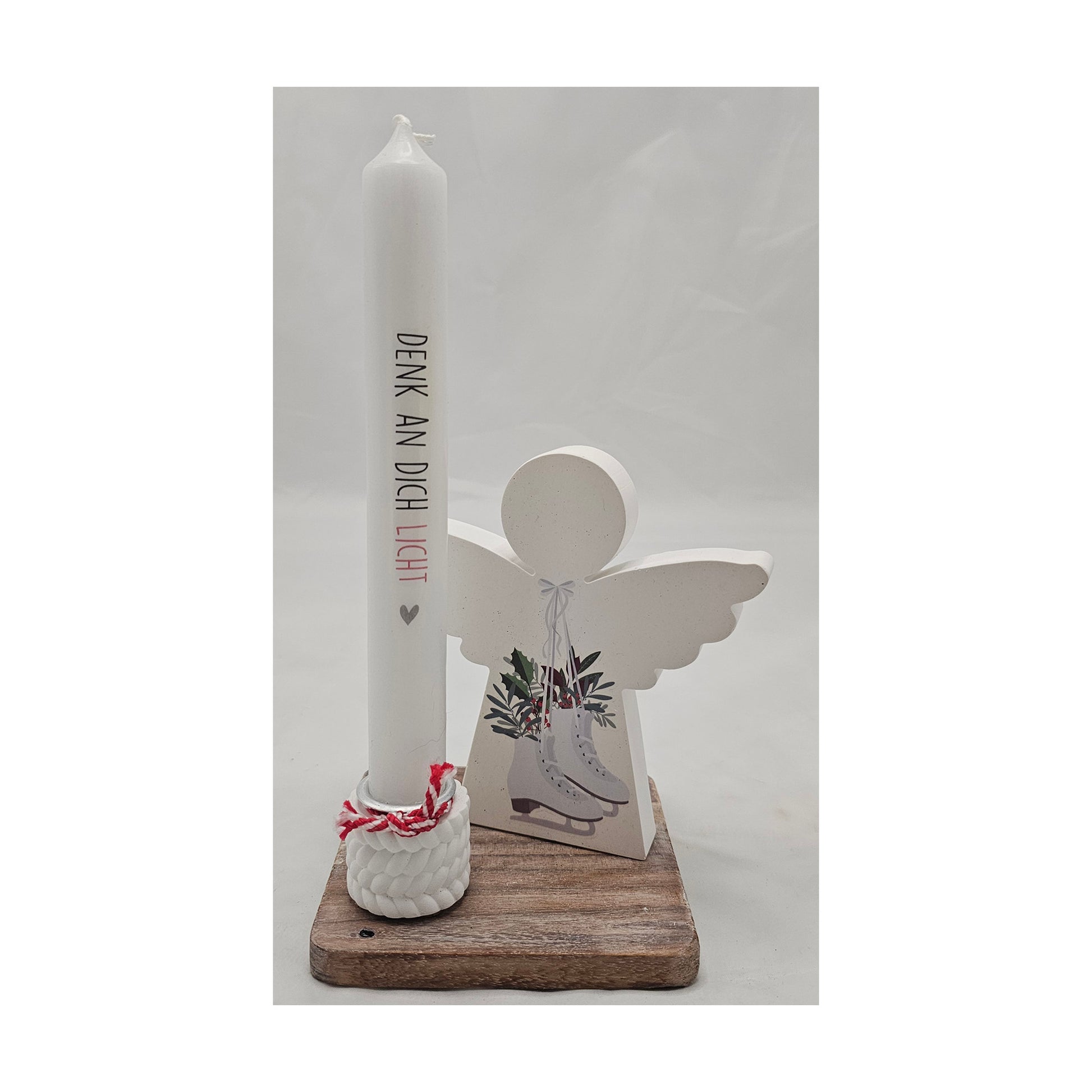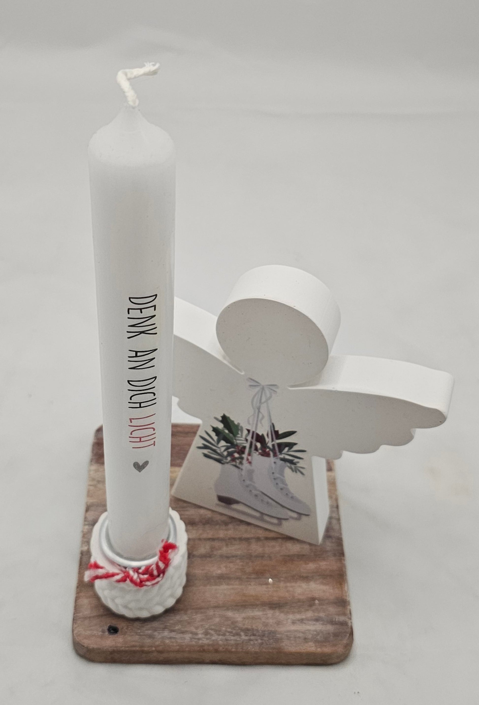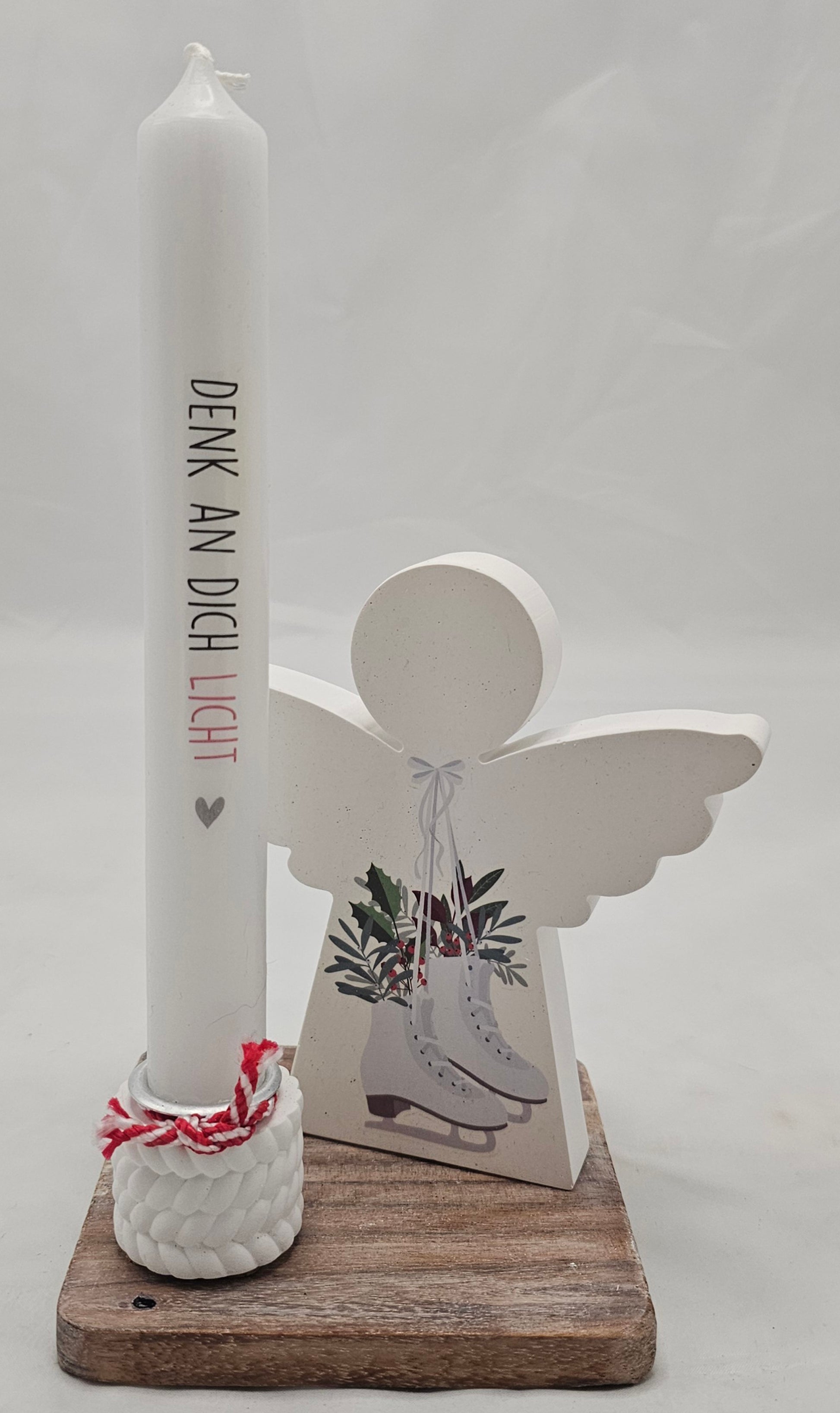 Deko Set "Engel" mit Stabkerzenhalter, incl. Kerze auf einem Holzuntersetzer.