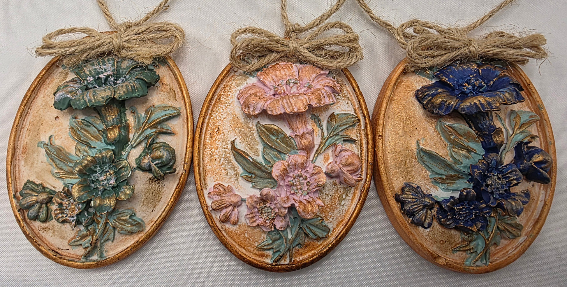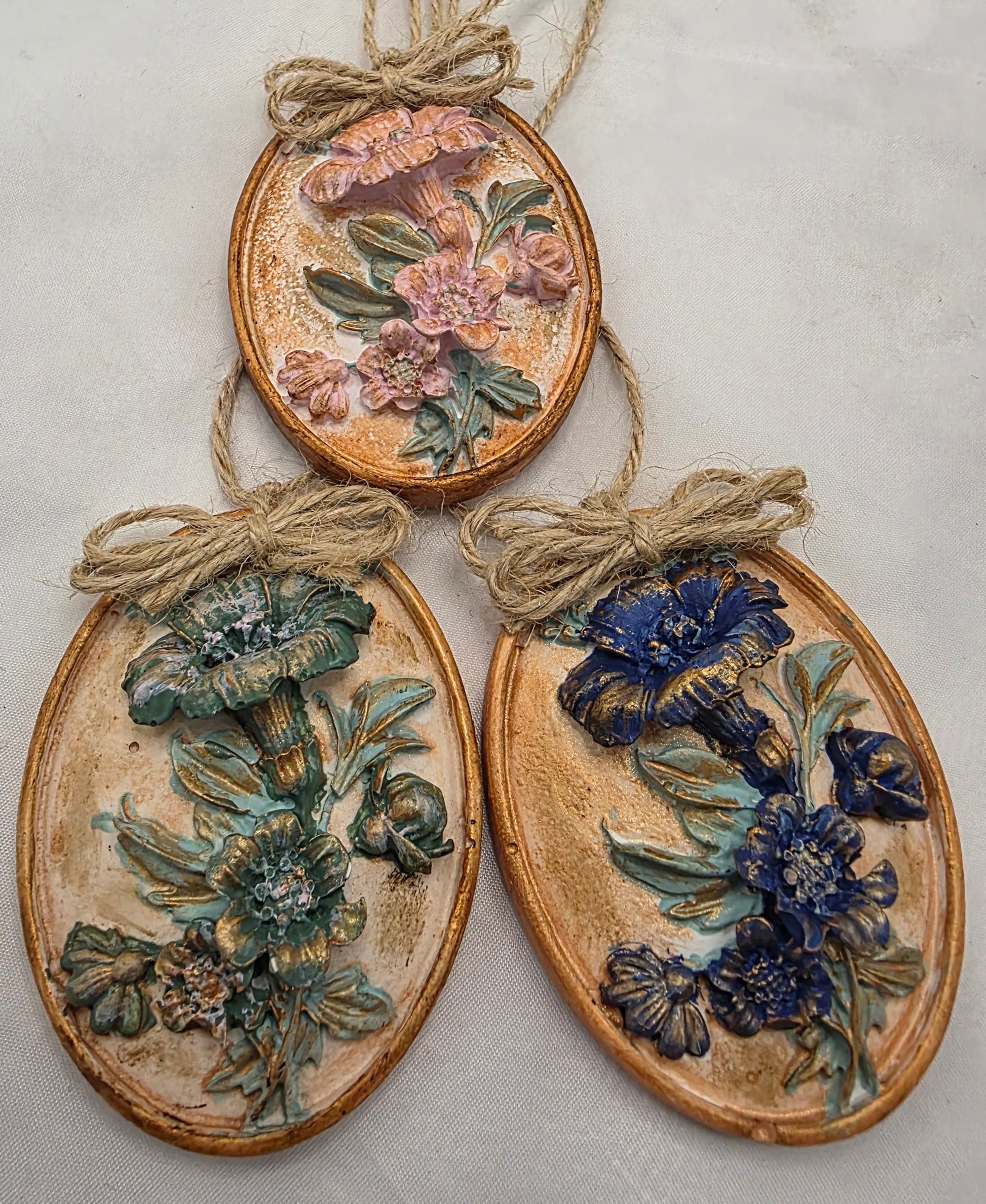 Eier im nostalgischem Look, aus Raysin gegossen und anschließend mit Kreidefarben bemalt und Antikwachs behandelt.