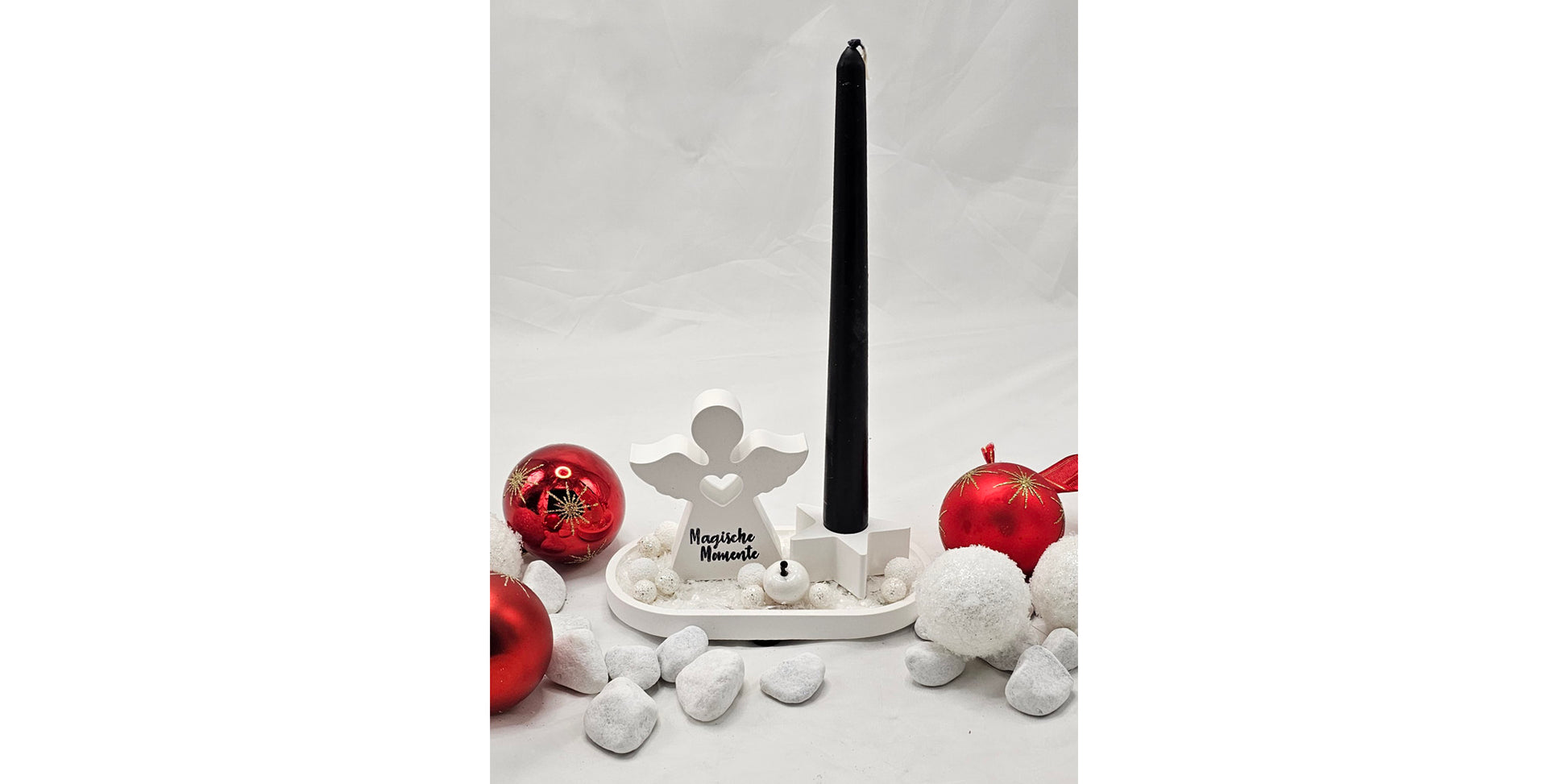 Engel "magische Momente" auf Dekoteller, mit Kerzenhalter in Sternform, dekoriert.