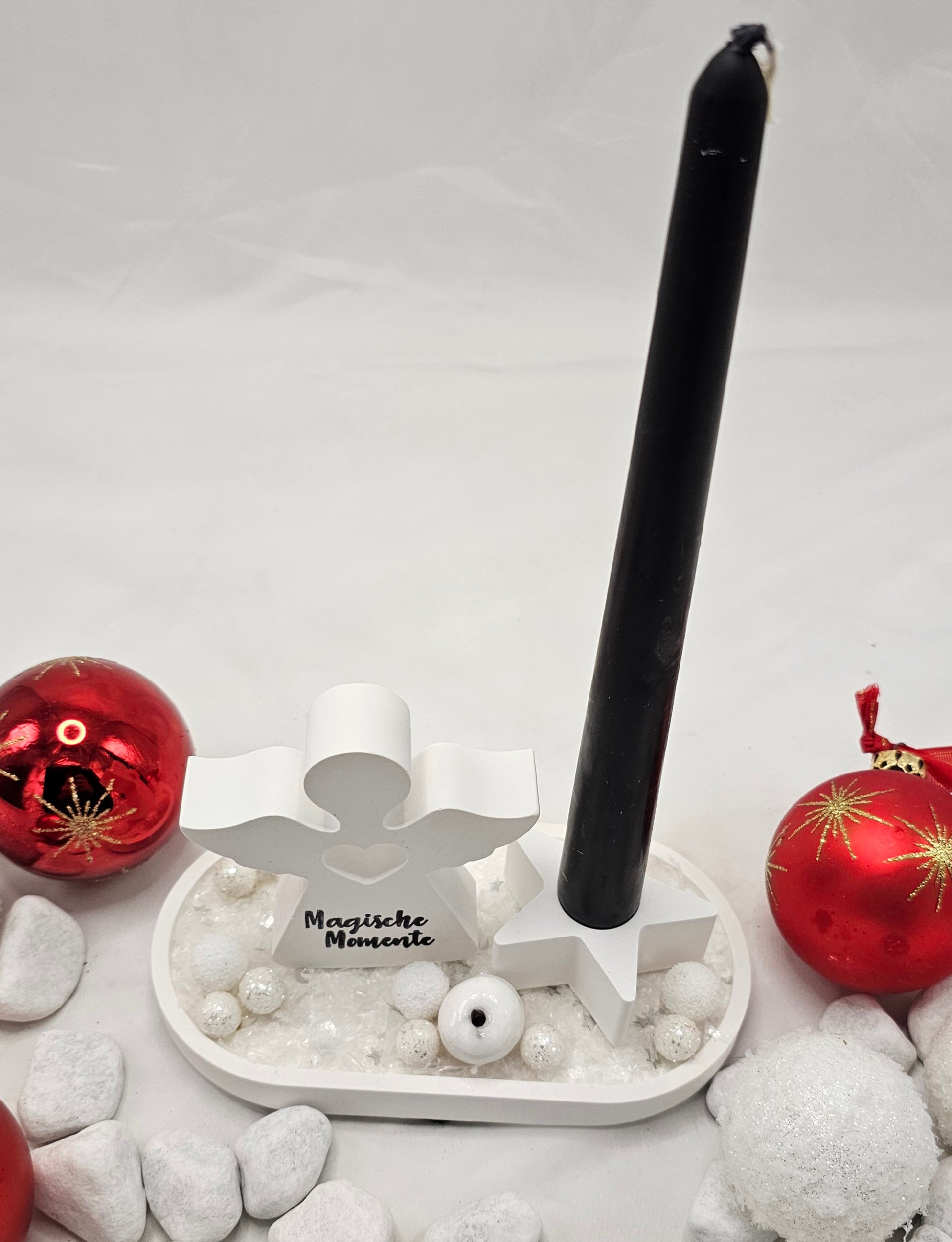 Engel, gestempelt mit dem Aufdruck "Magische Momente", auf Dekotablett mit Sternförmigen Kerzenhalter winterlich dekoriert. Engel, Kerzenhalter und Tablett sind aus Raysin gegossen und geschliffen. Nur für den Innenbereich geeignet, da das Material nicht wetterfest ist.