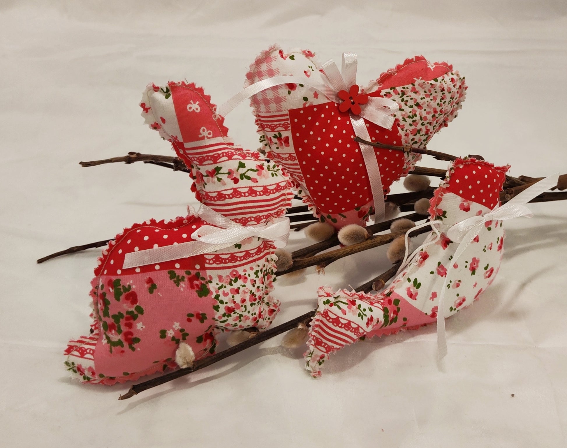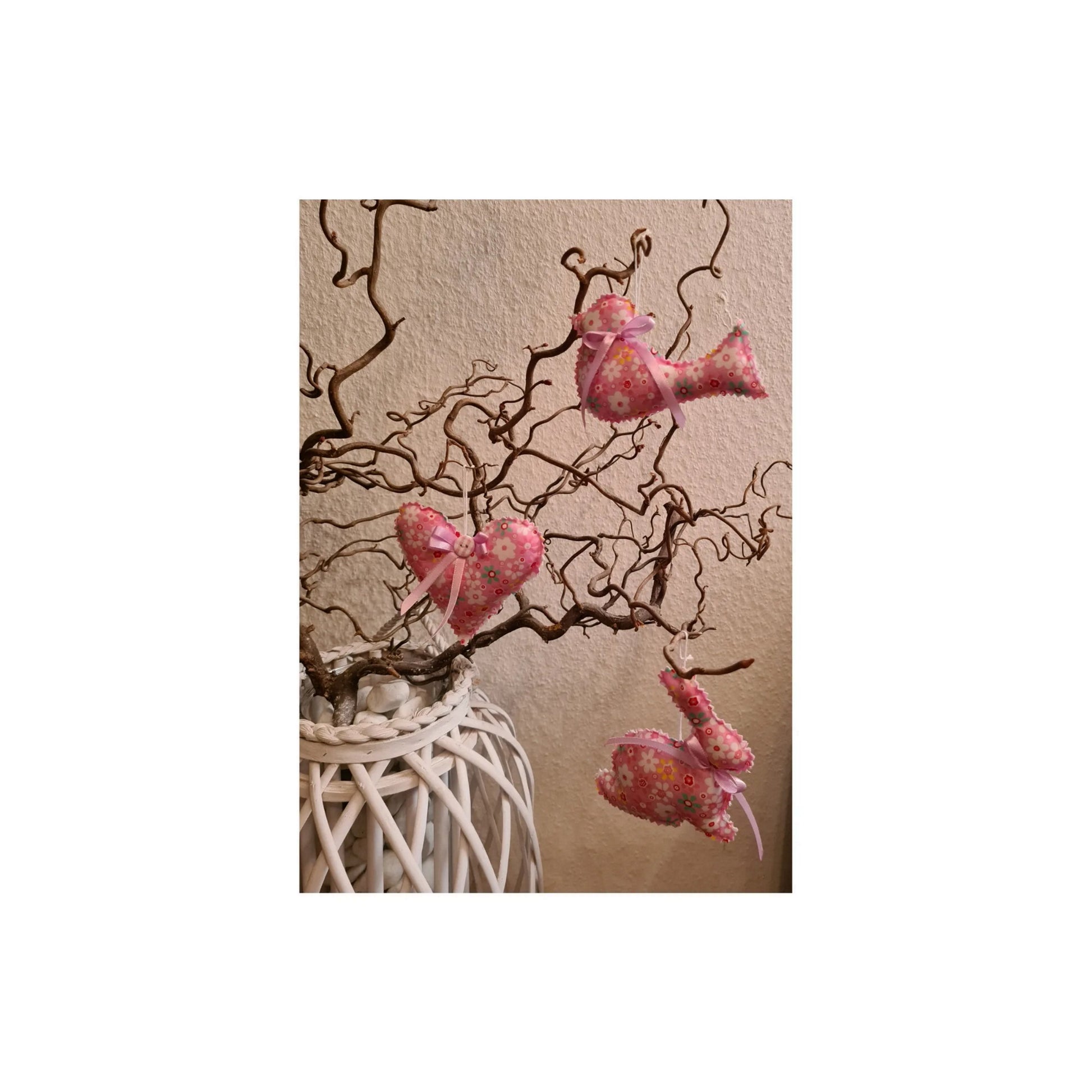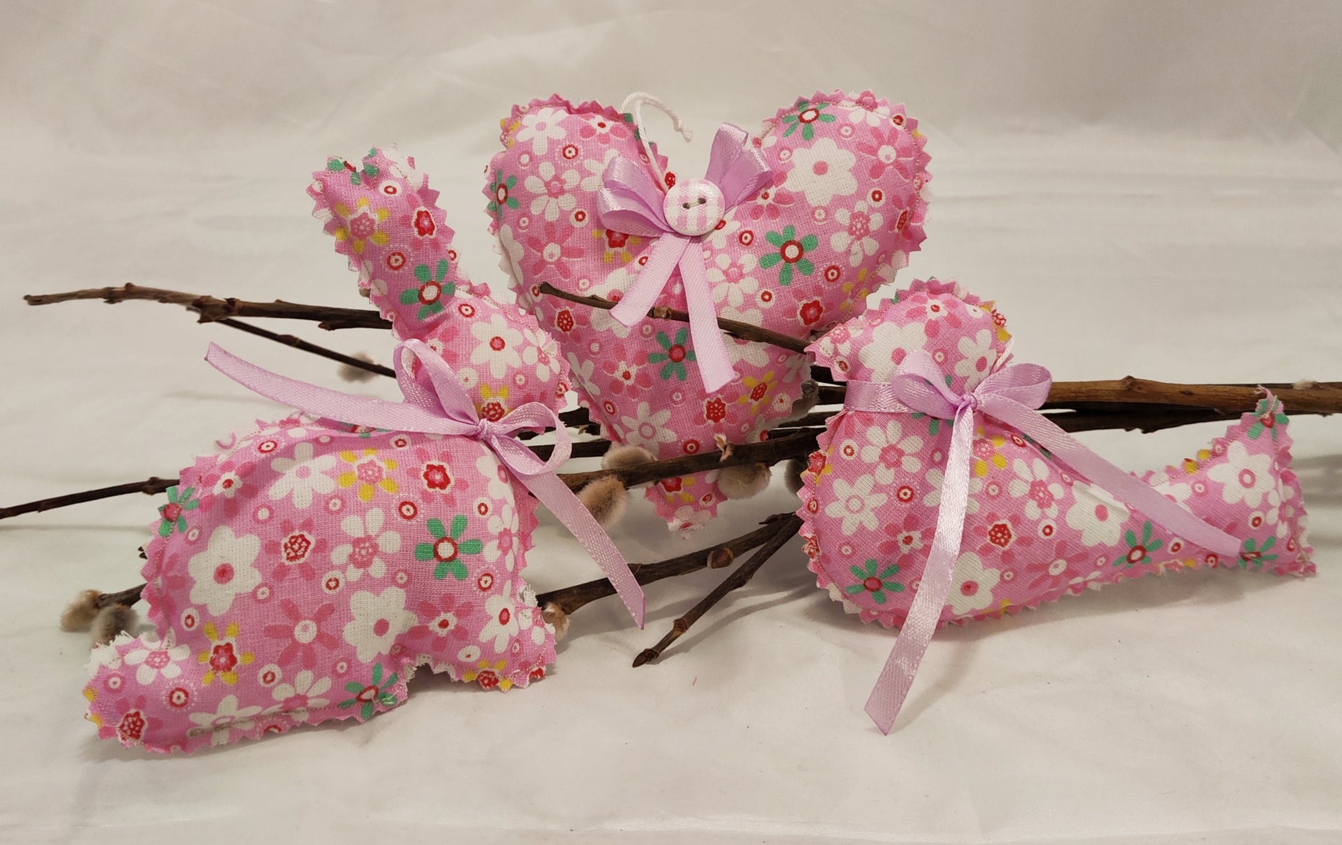 Frühlingsboten im 3er Set. Vogel, Herz und Hase aus Baumwollstoff, mit Knopf und Satinschleife. Sehr schöne Hängedeko im Frühling und zur Osterzeit.
