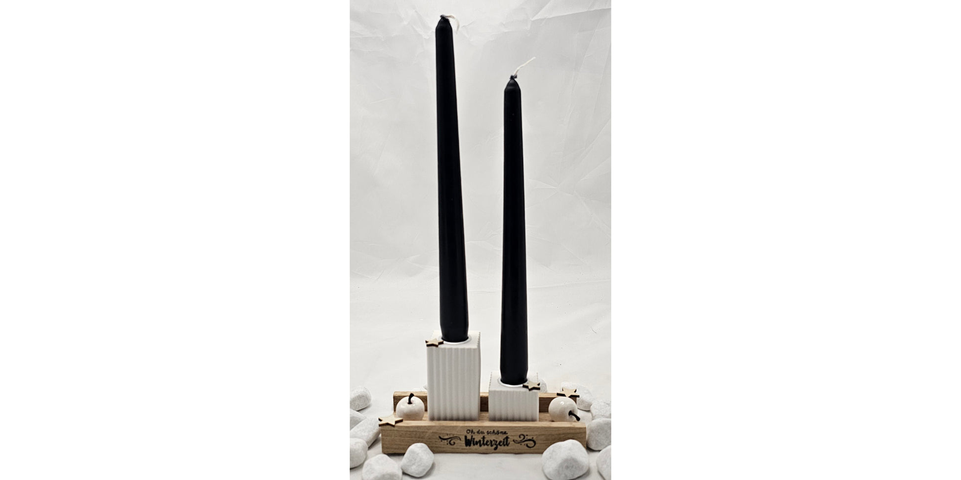 Geschenk-Set "Oh du schöne Winterzeit", bestehend aus 2 Kerzenhalter, aus Raysin gegossen und geschliffen. Die Aufschrift auf dem Klötzchenständer ist gestempelt. Winterlich dekoriert mit kleinen Äpfeln und Beeren. Nur für den Innenbereich geeignet, da das Material nicht wetterfest ist.