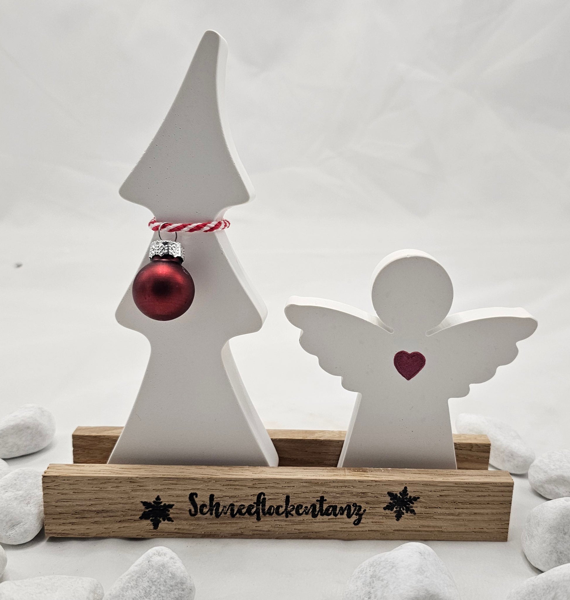 Geschenk-Set "Schneeflockentanz", bestehend aus einer Tanne und einem Engel, aus Raysin gegossen und geschliffen. Das Herz auf dem Engel ist mit Acrylfarbe drauf gemalt. Die Aufschrift auf dem Klötzchenständer ist gestempelt. Nur für den Innenbereich geeignet, da das Material nicht wetterfest ist.