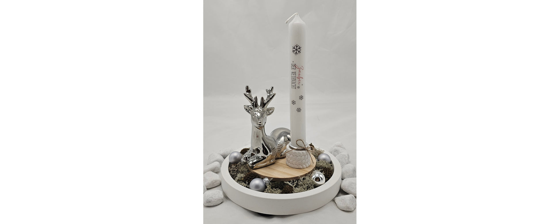 Geschenk Set "silberner Hirsch", winterlich schlicht dekoriert.