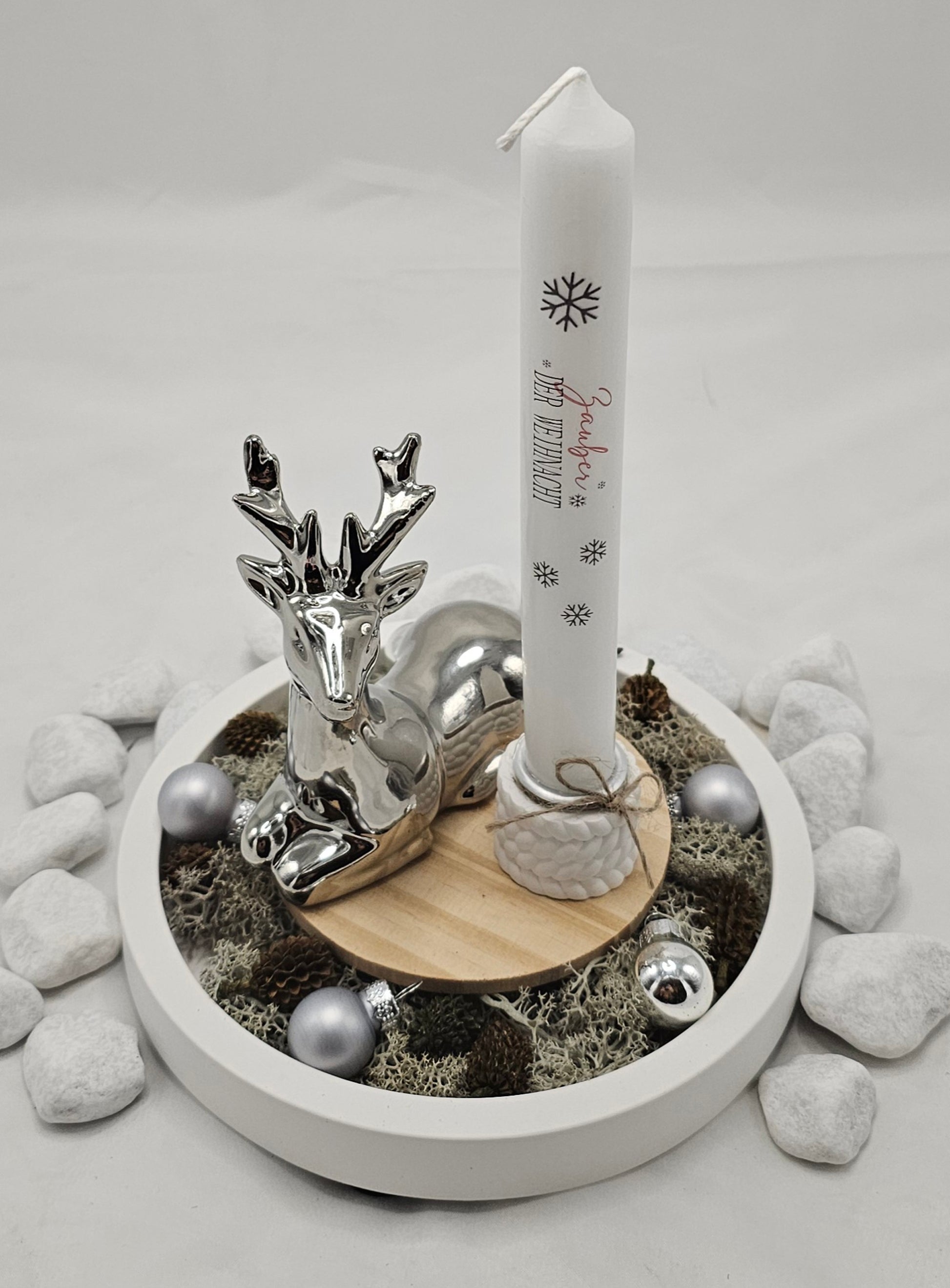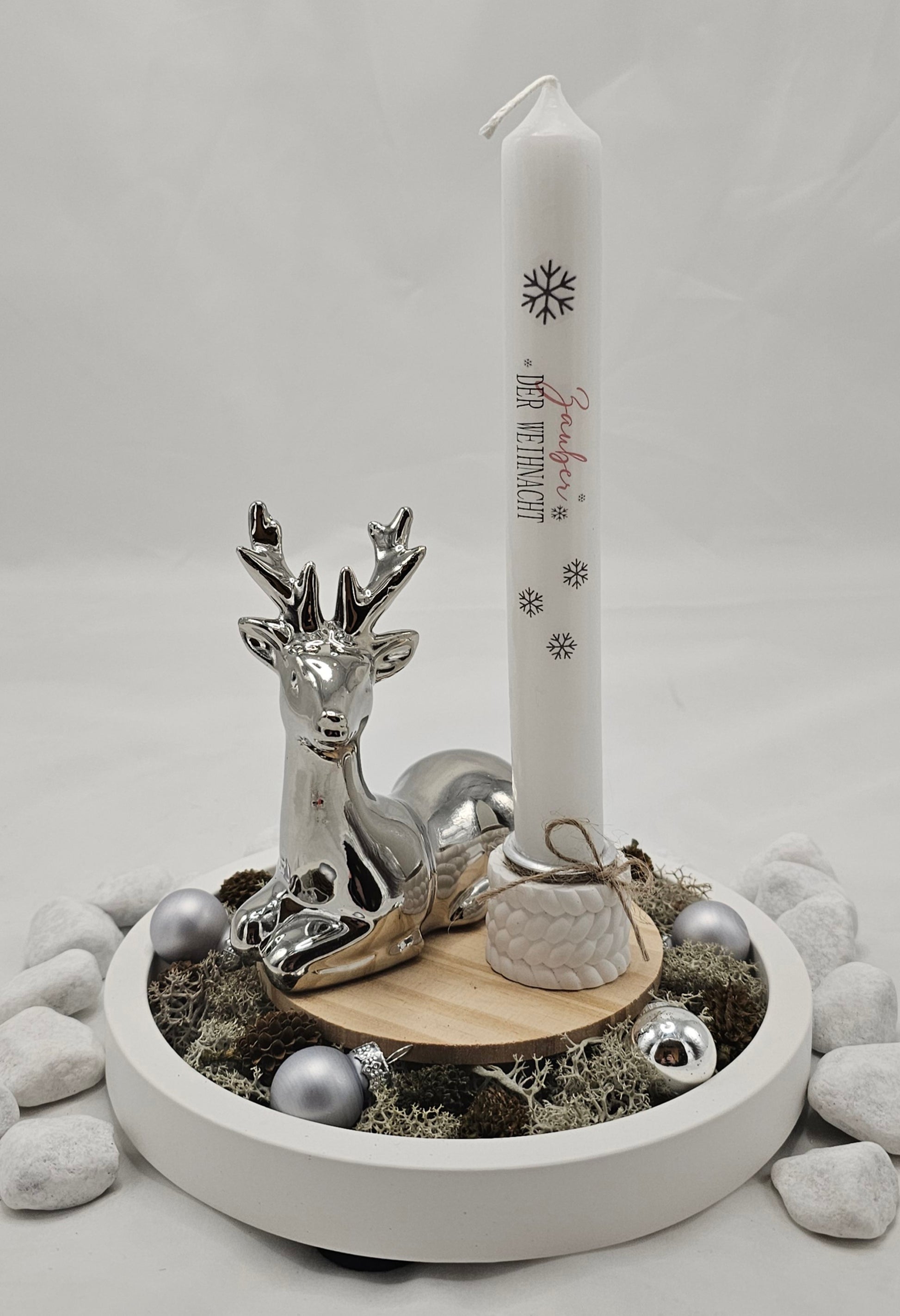Geschenk-Set "silberner Hirsch", bestehend aus einem dekoriertem Teller, einem Kerzenhalter incl. Kerze und einem Hirsch in silber. Der Teller und der Kerzenhalter sind aus Raysin gegossen und geschliffen. Weihnachtlich schlicht dekoriert. Nur für den Innenbereich geeignet, da das Material nicht wetterfest ist.