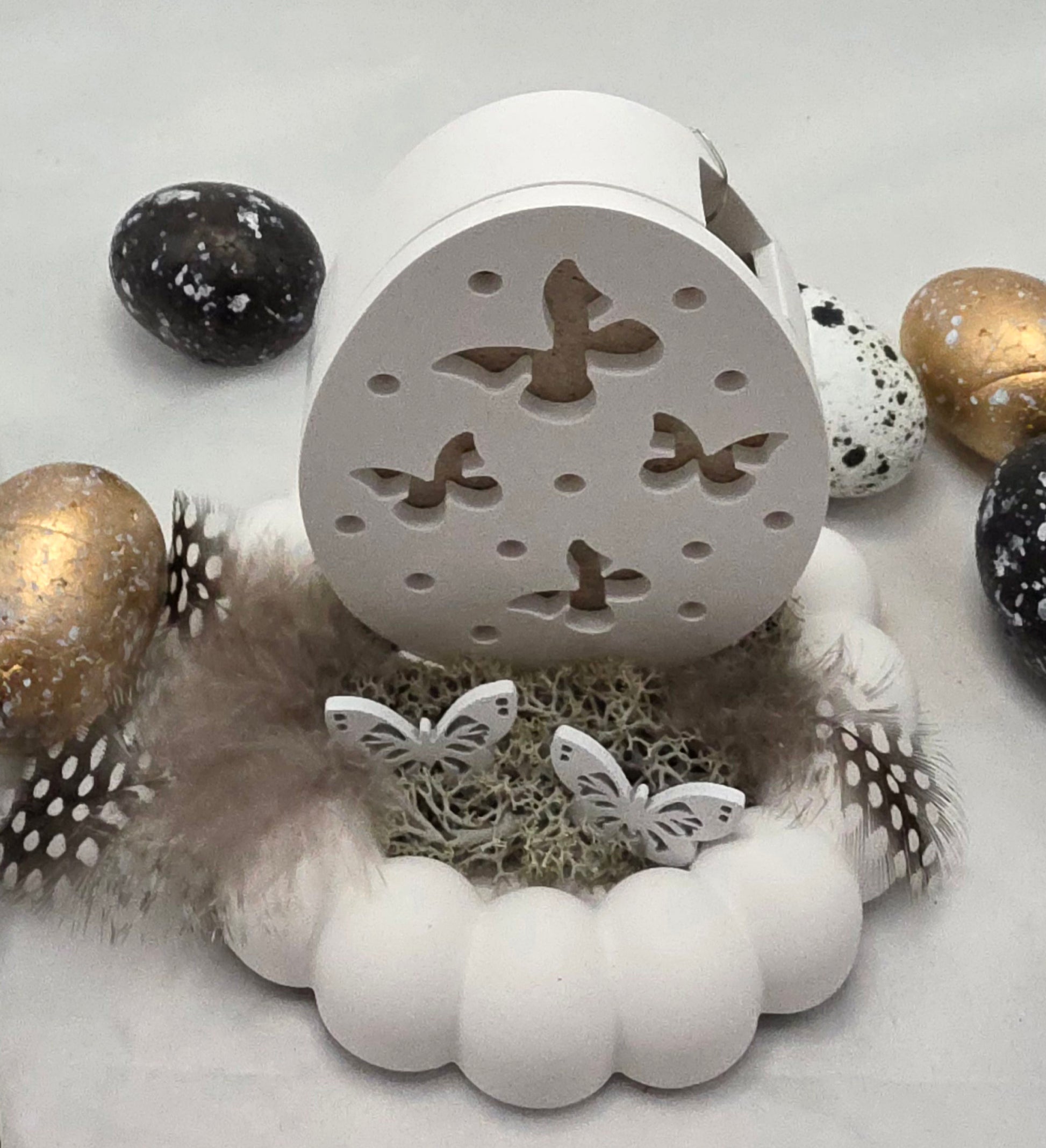 Schöne Geschenksets, Hasenhaus,- Ei,- und Hasenlämpchen, auf einem Teller aus Raysin, österlich mit Moos, Federn, mini Eiern, Holzhäschen, Schmetterlingen und Möhren dekoriert.