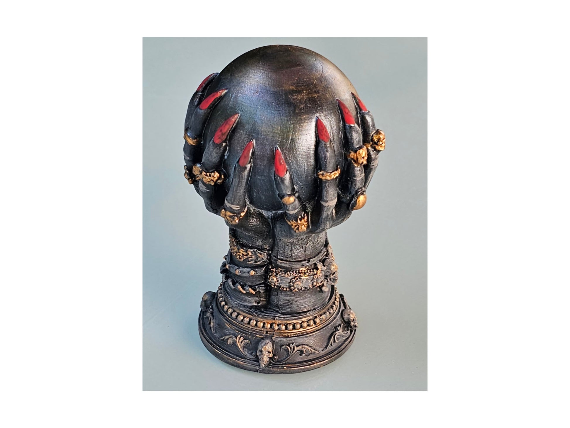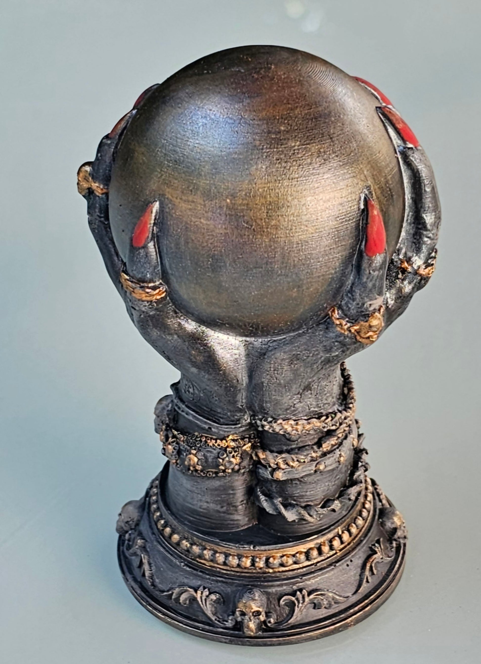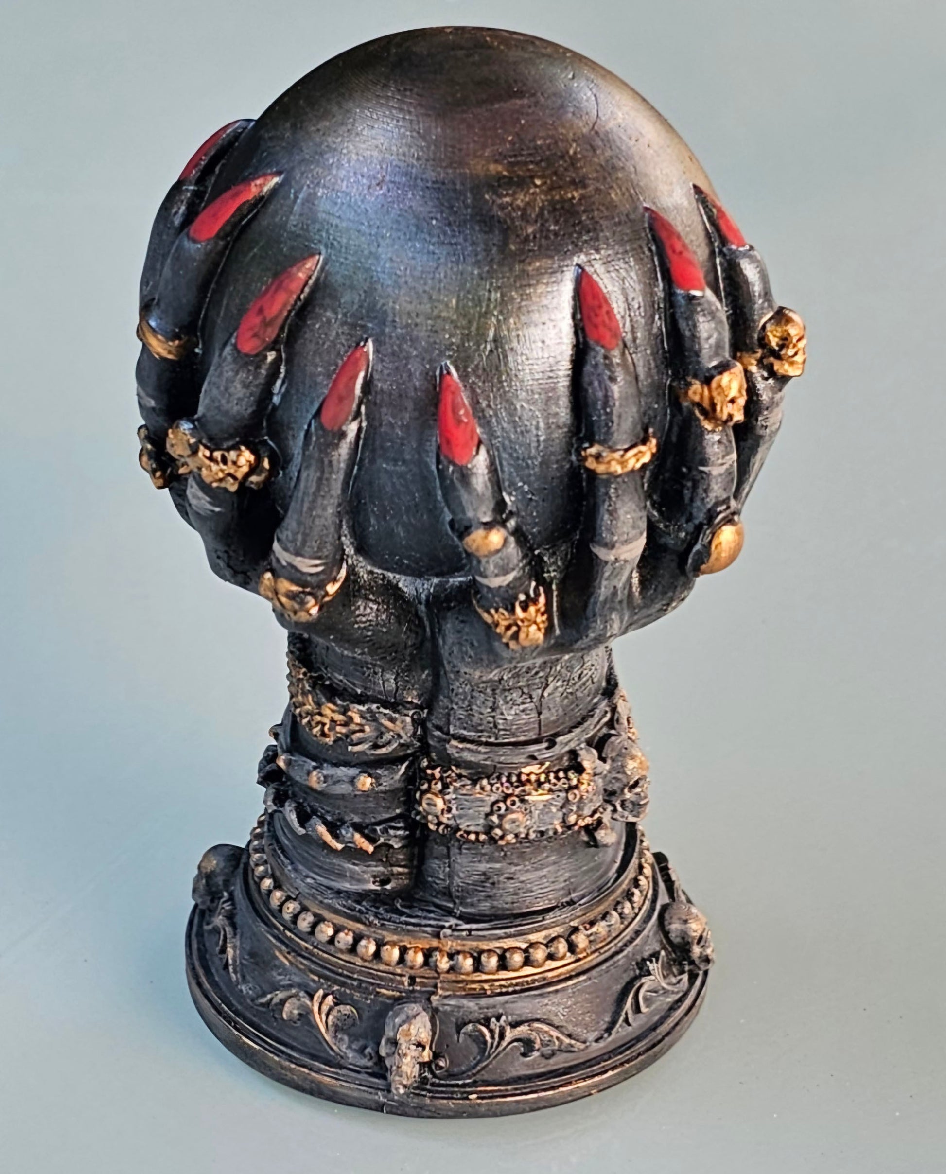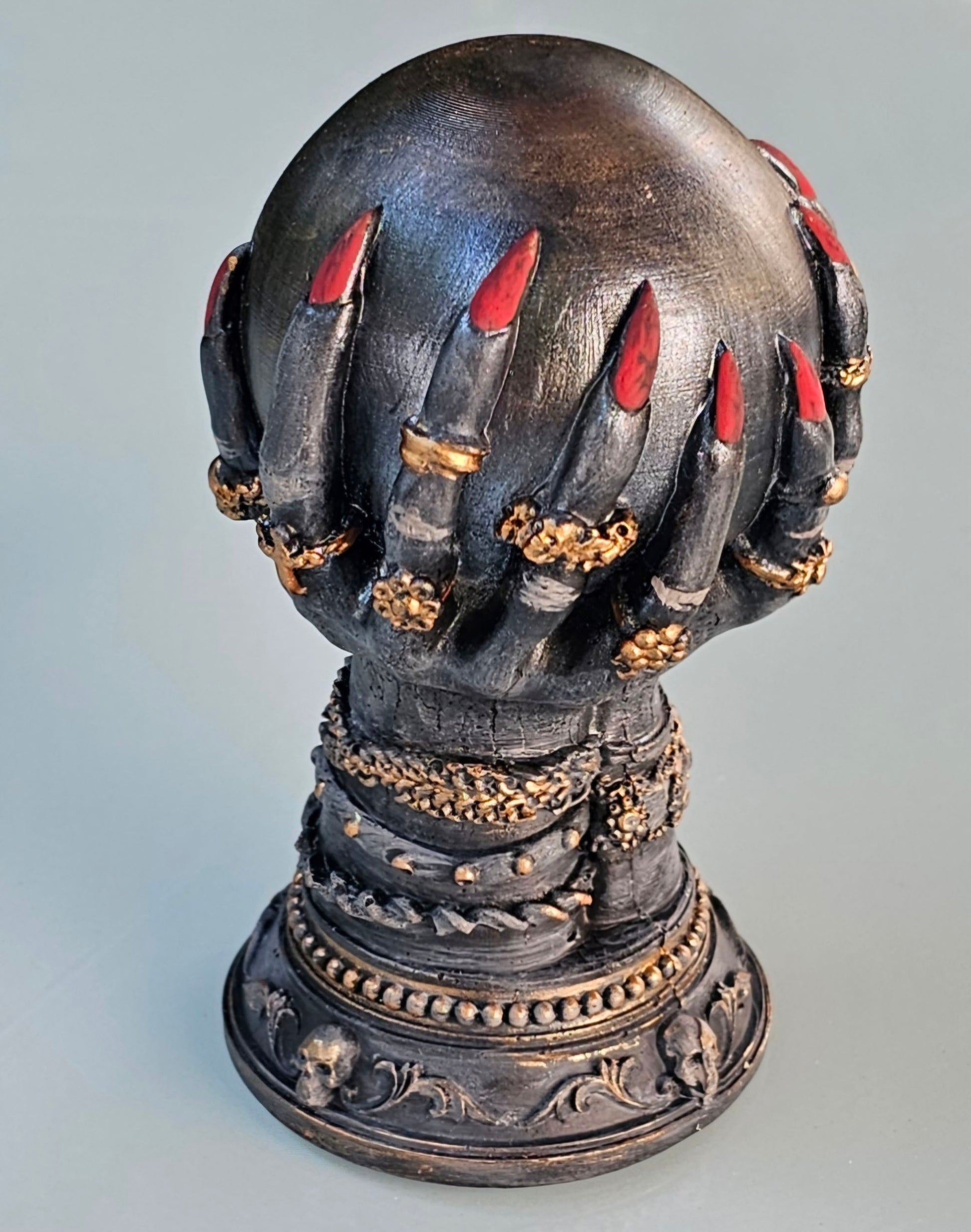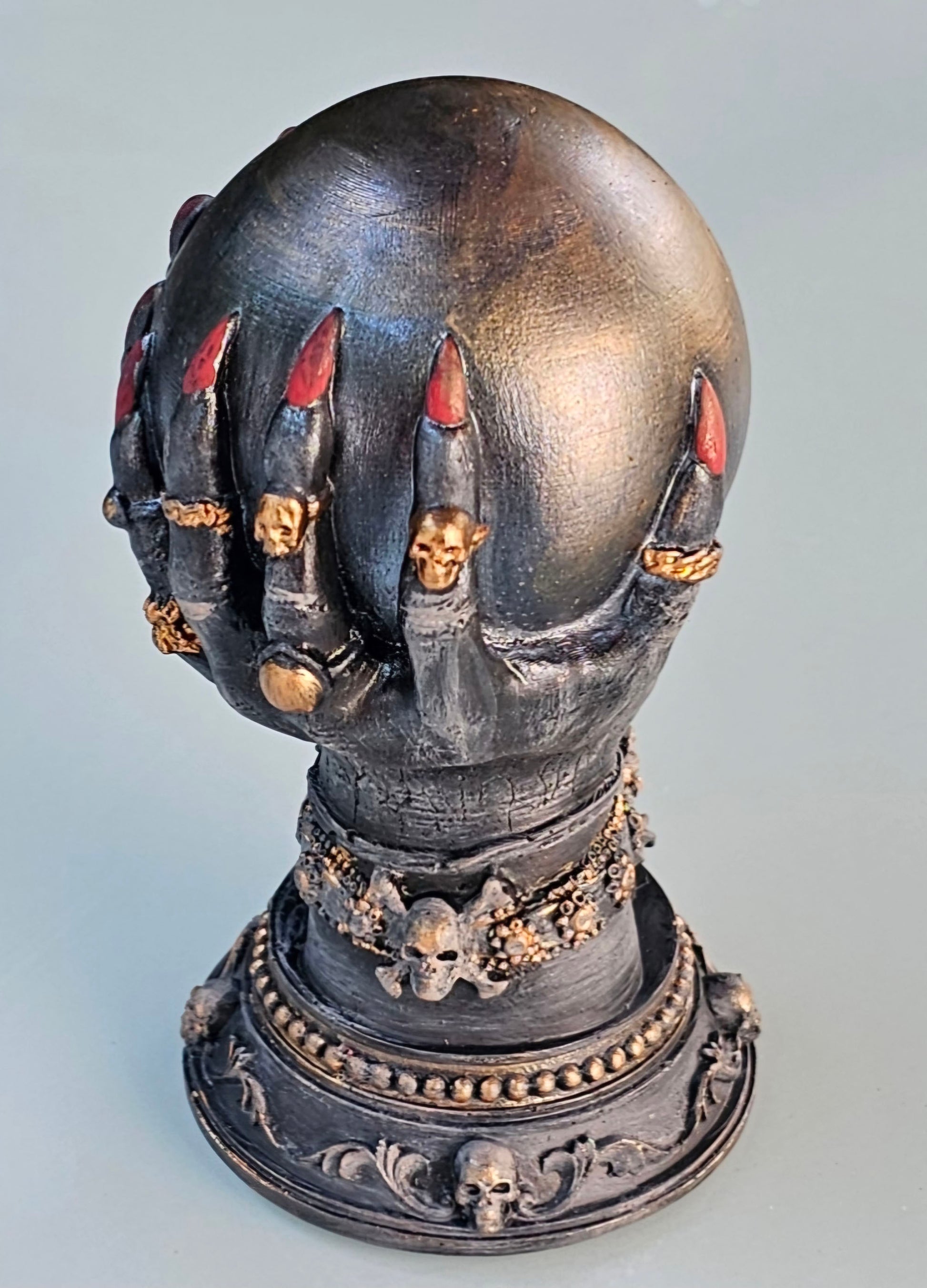 Krallenhände mit Zauberkugel, aus Raysin gegossen, geschliffen und mit Abtön,- und Acrylfarben bemalt. Anschließend mit mattem Klarlack versiegelt.