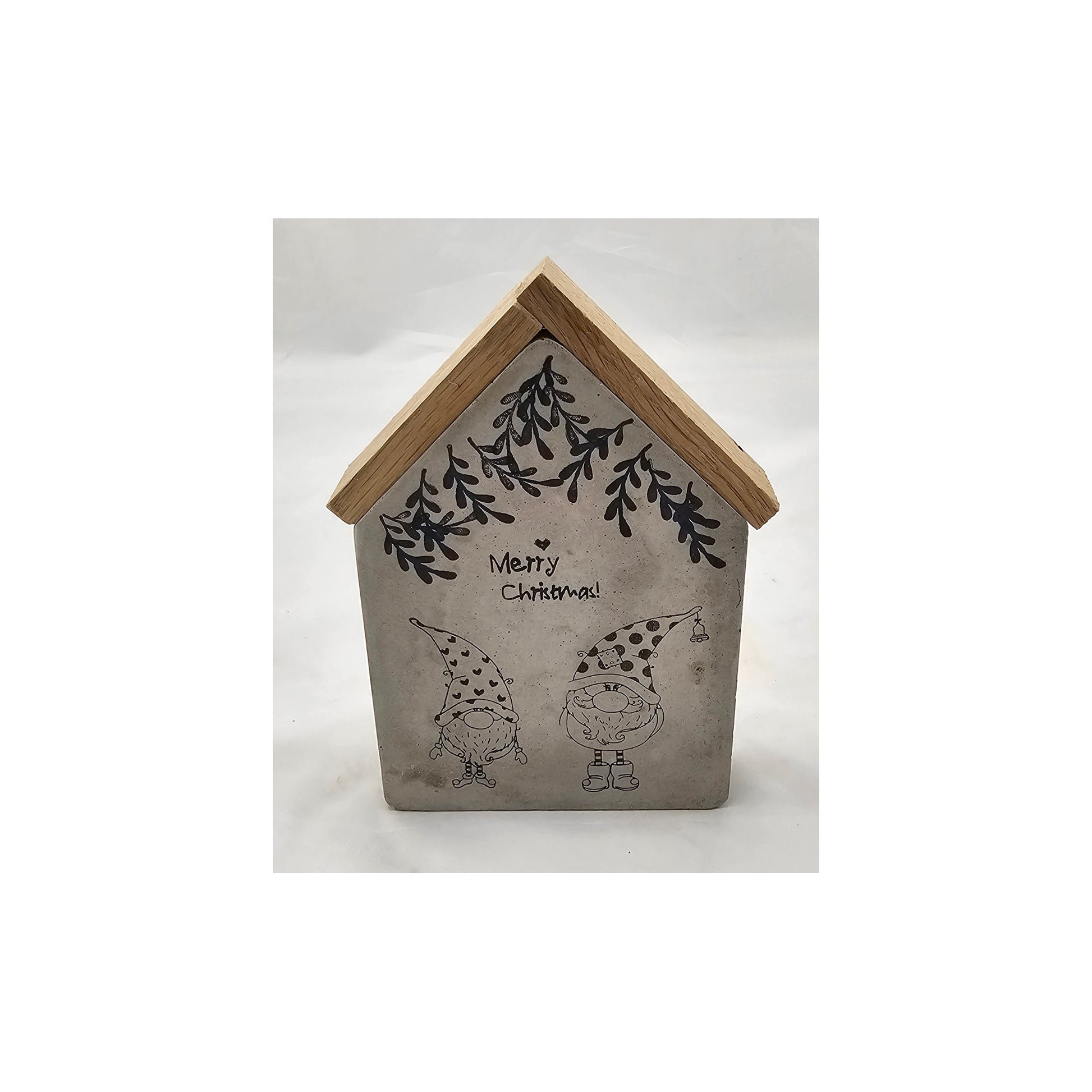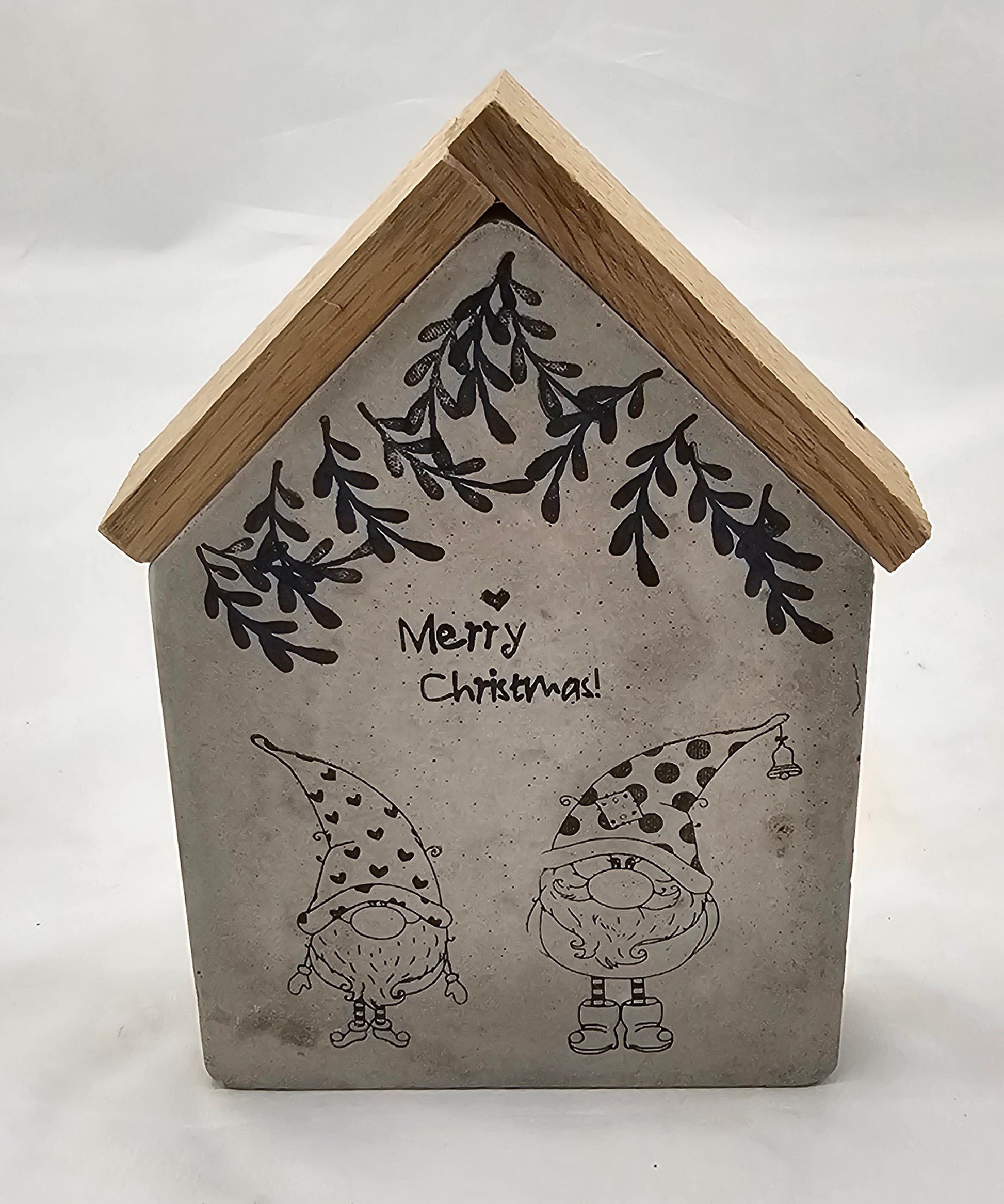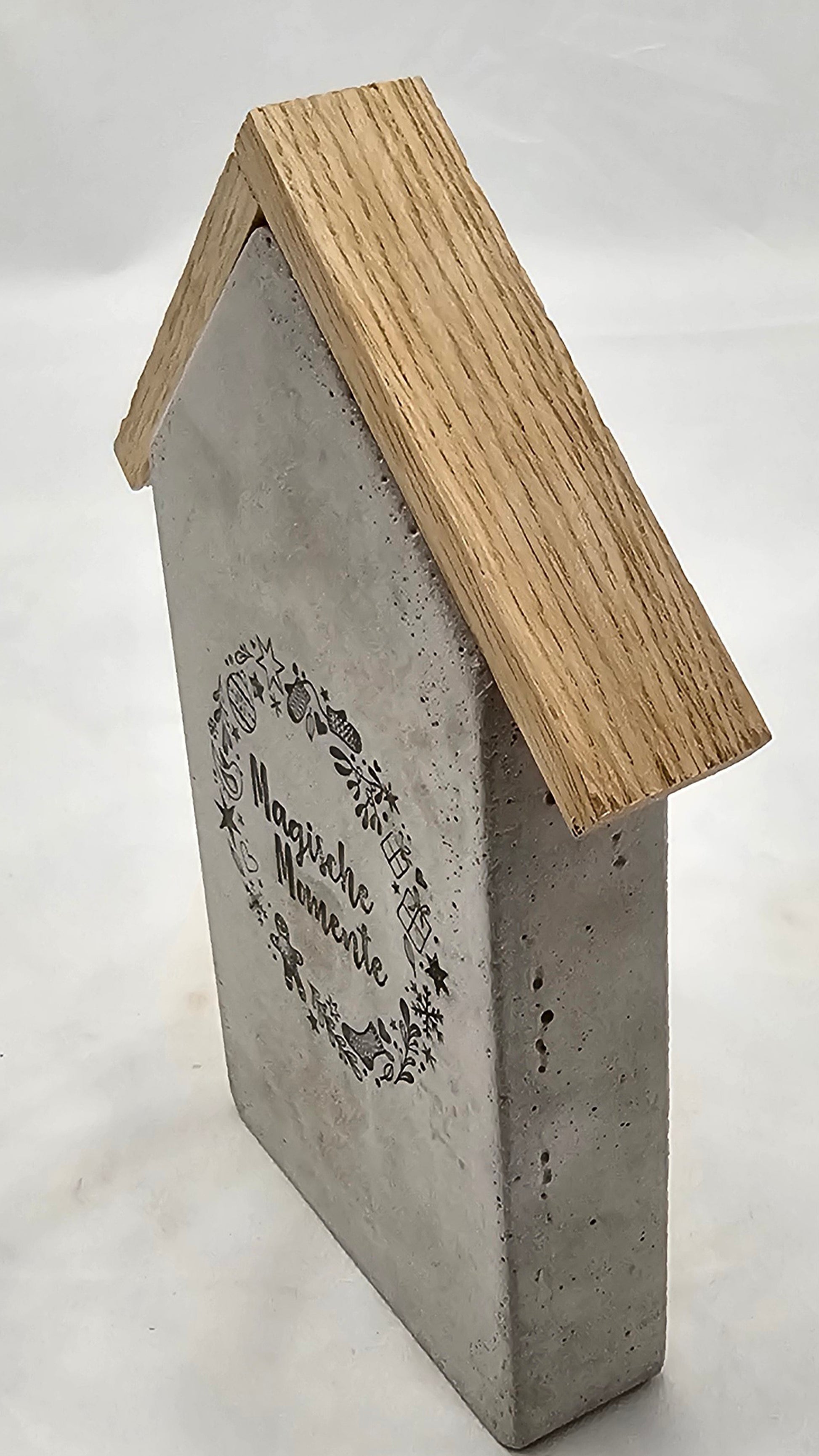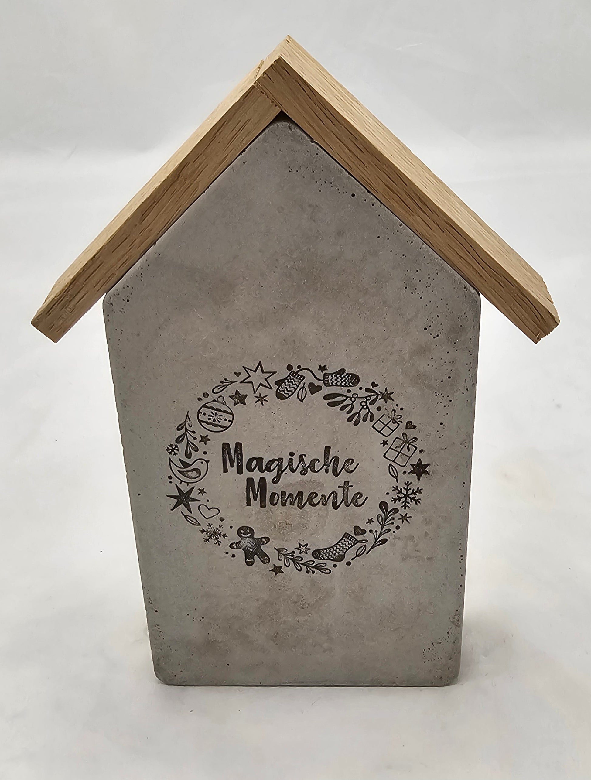 Deko Häuser aus Beton gegossen und geschliffen und mit Holzklötzchen ein Dach gemacht. Die Motive sind gestempelt.