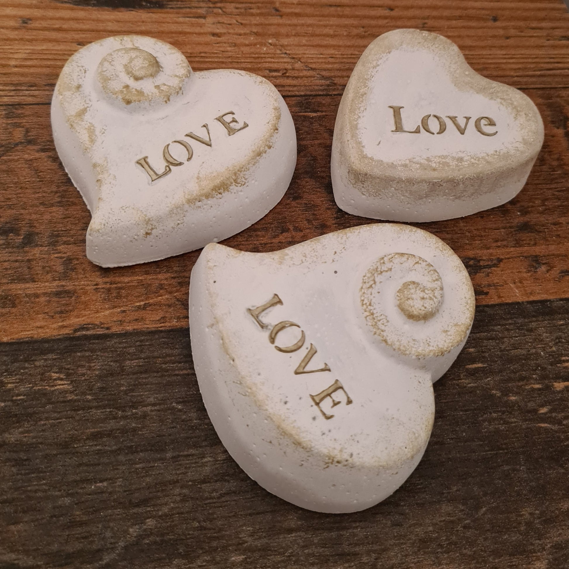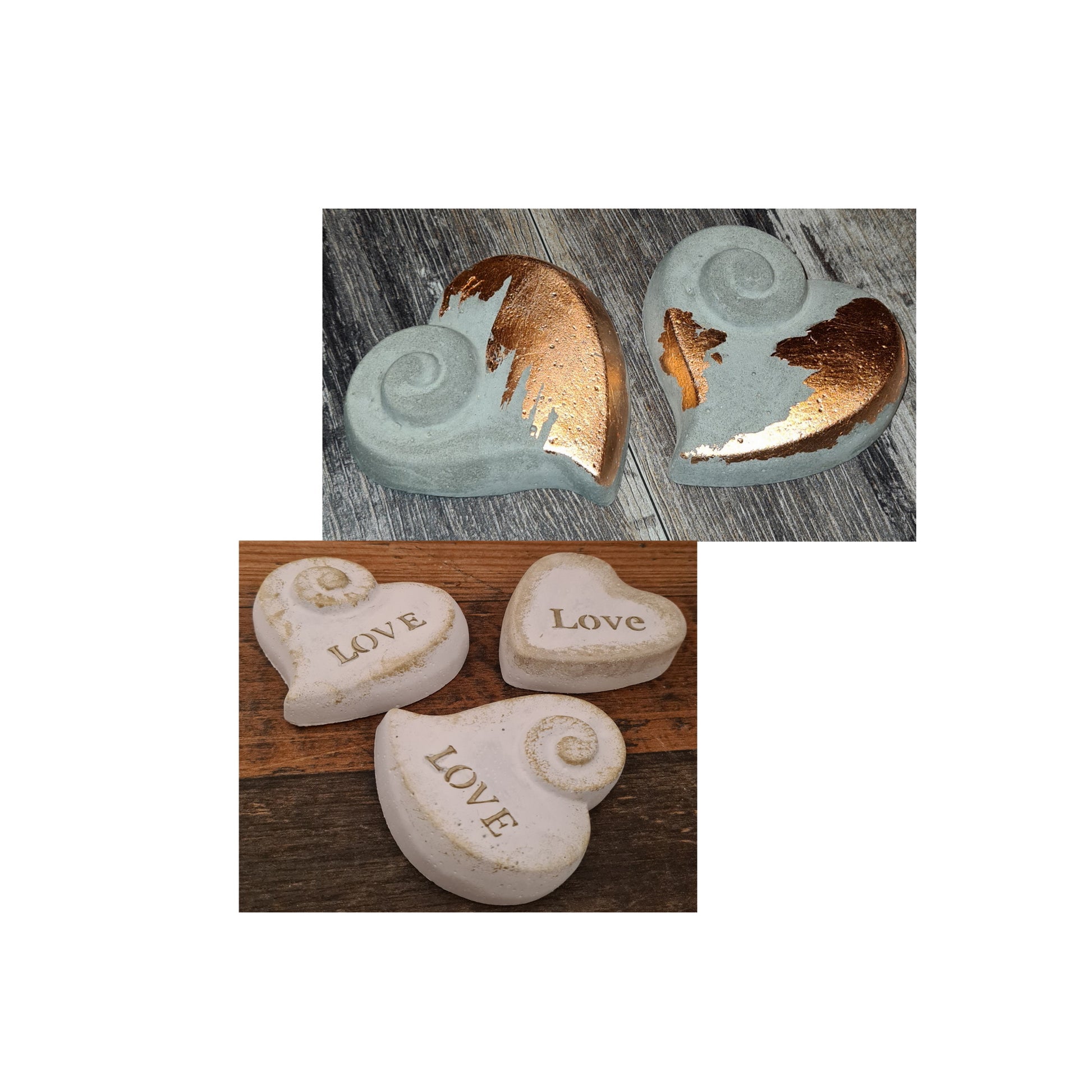 Herzen aus Beton gegossen. Das 2er Set habe ich mit Ersatzblattgold dekoriert. Das 3er Set ist weiß bemalt, dann mit Decor-Creme schabloniert, dadurch wirkt die Schrift in 3D.