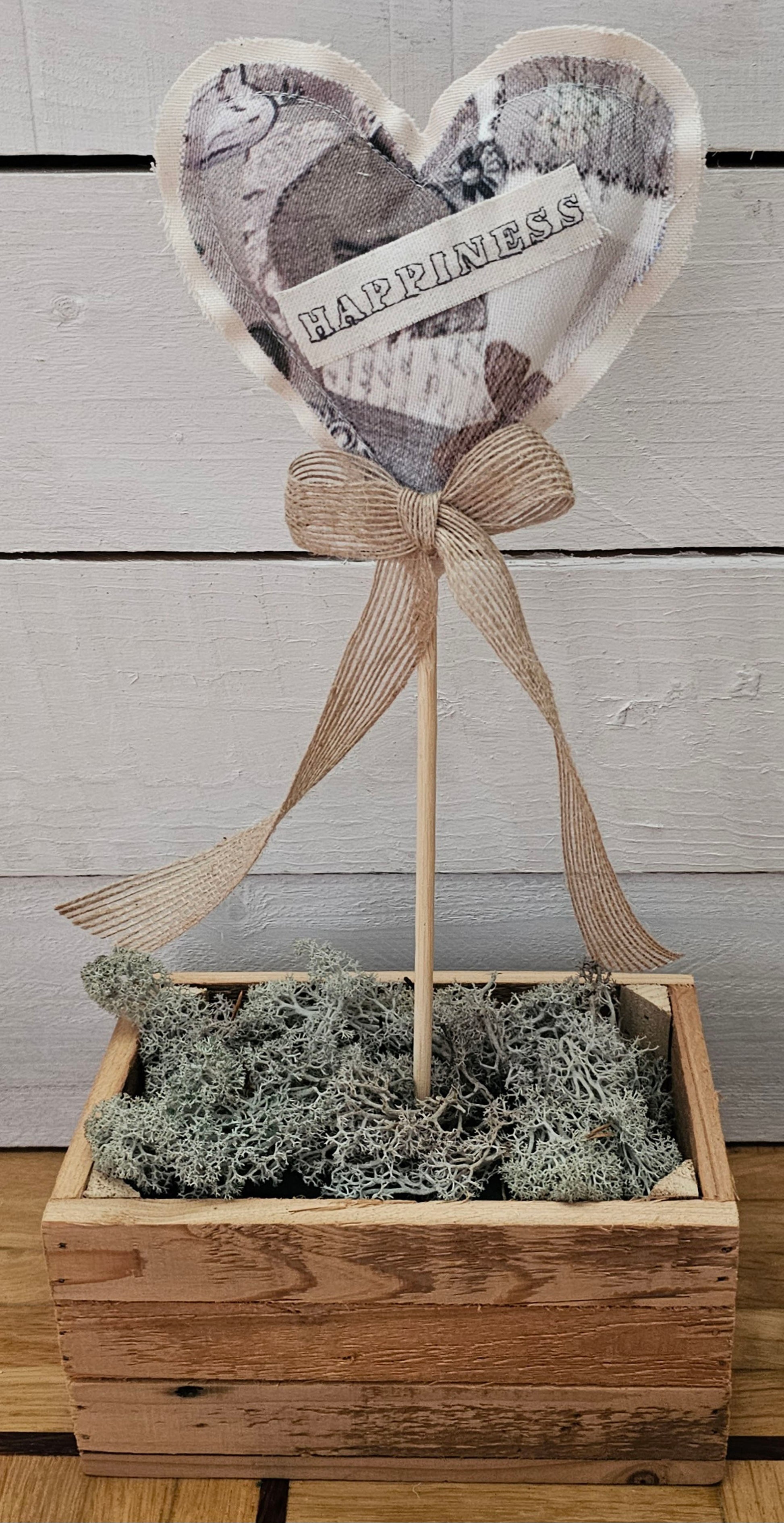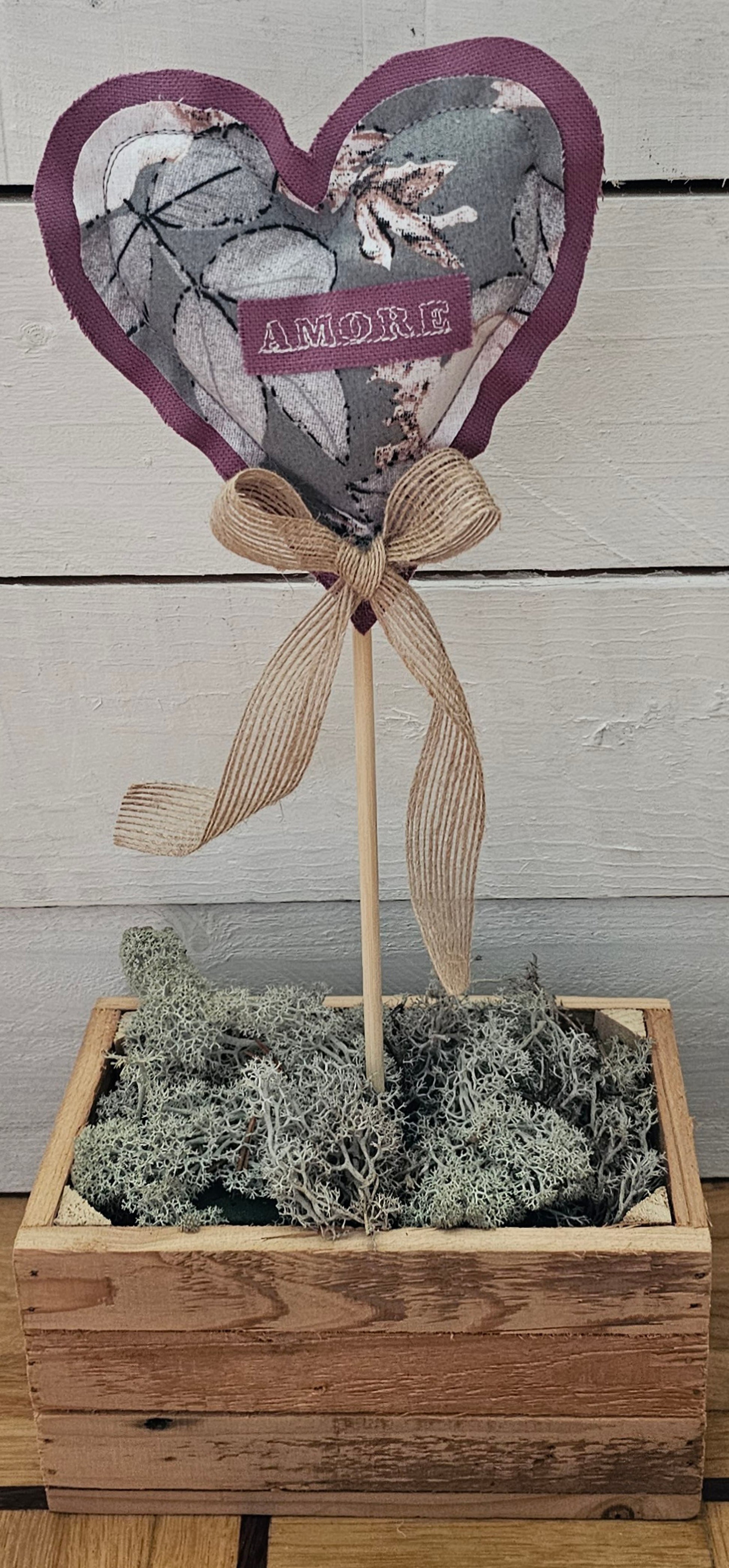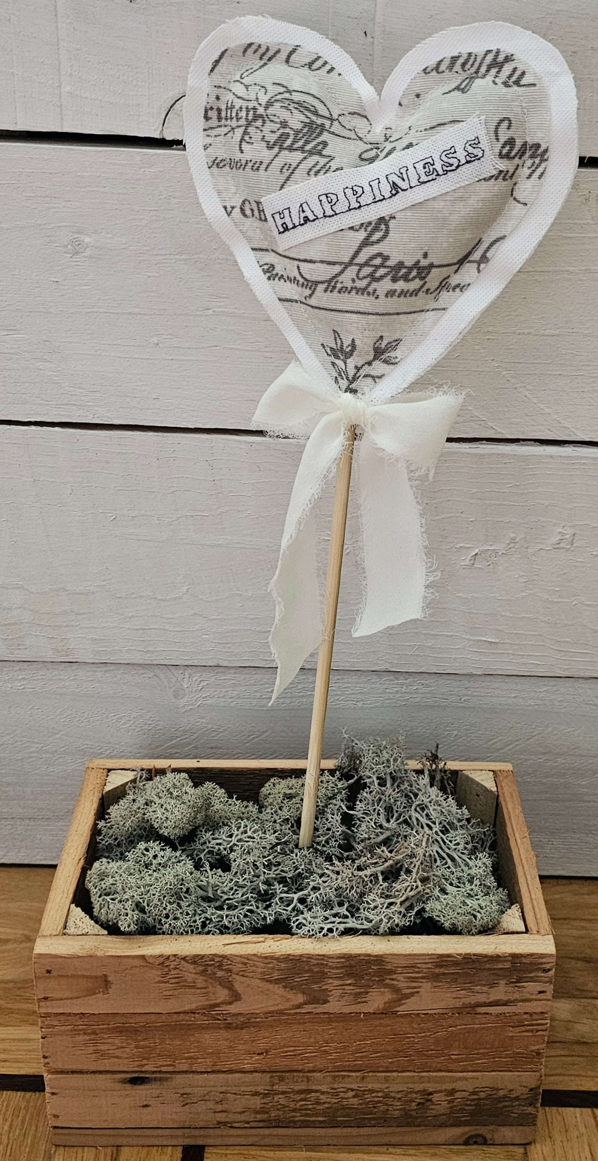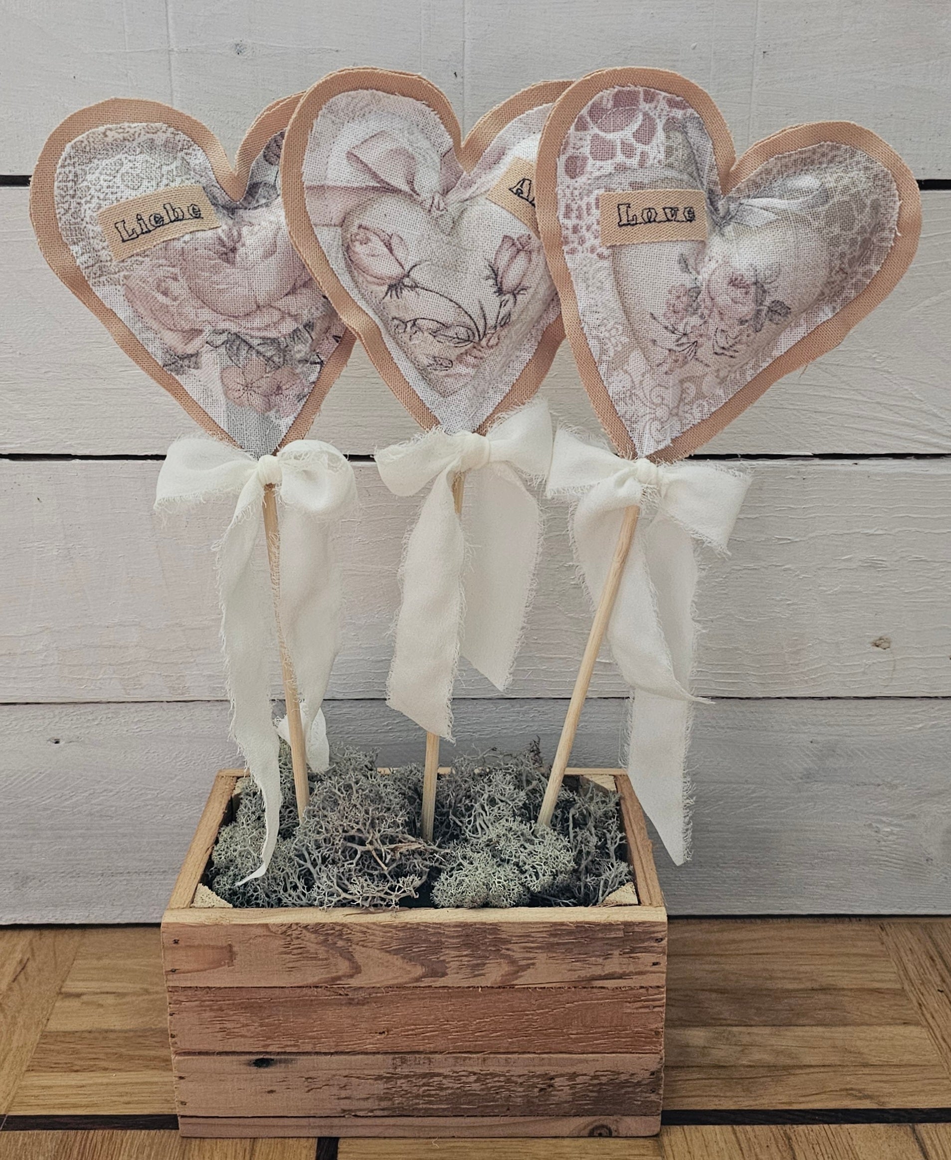 Selbstgenähte zauberhafte Herzen für jeden Anlass, zum stecken mit Holzstab, im Shabby-Chic, bzw. Vintage-Look. Jedes Herz ein Unikat.
