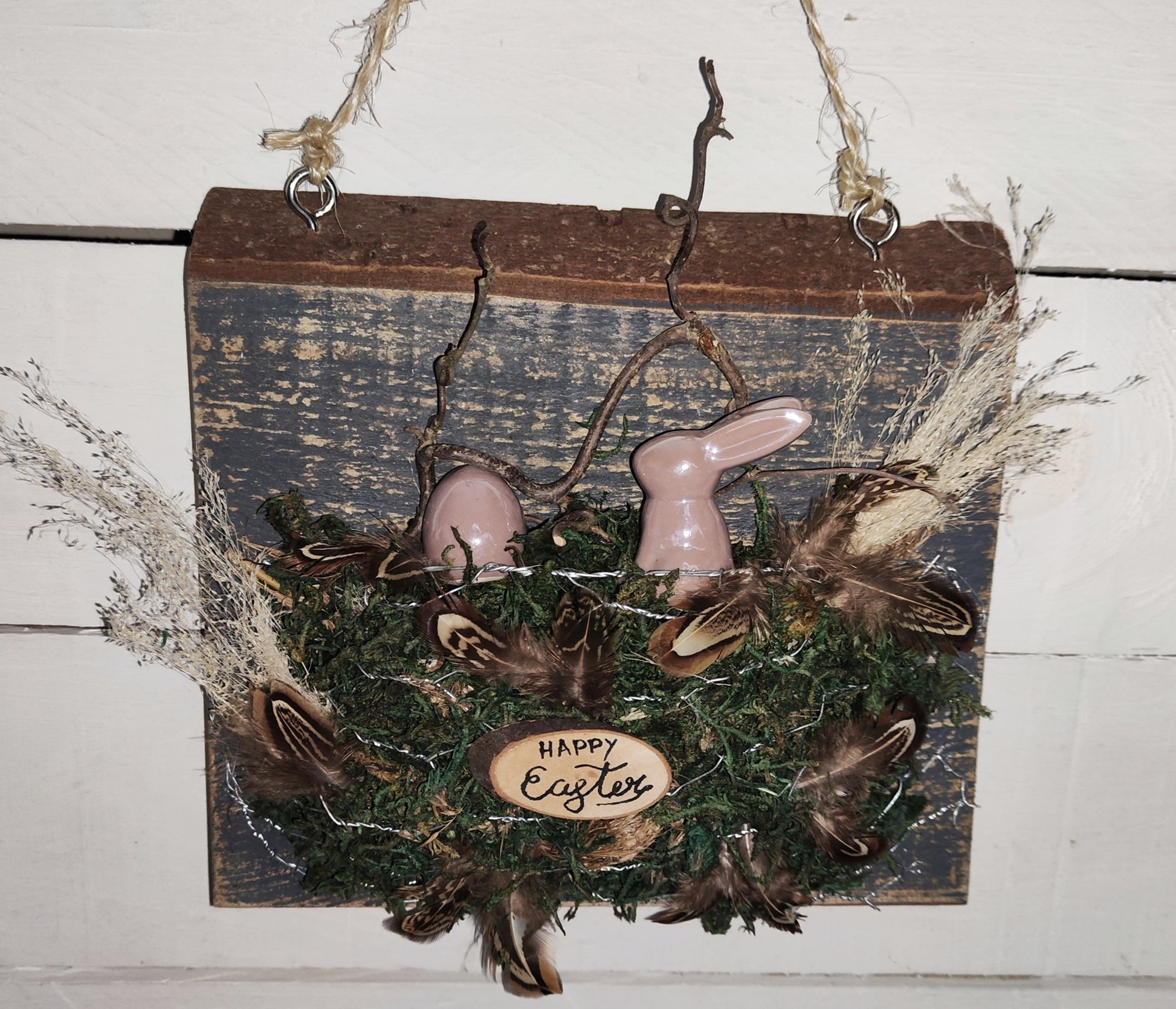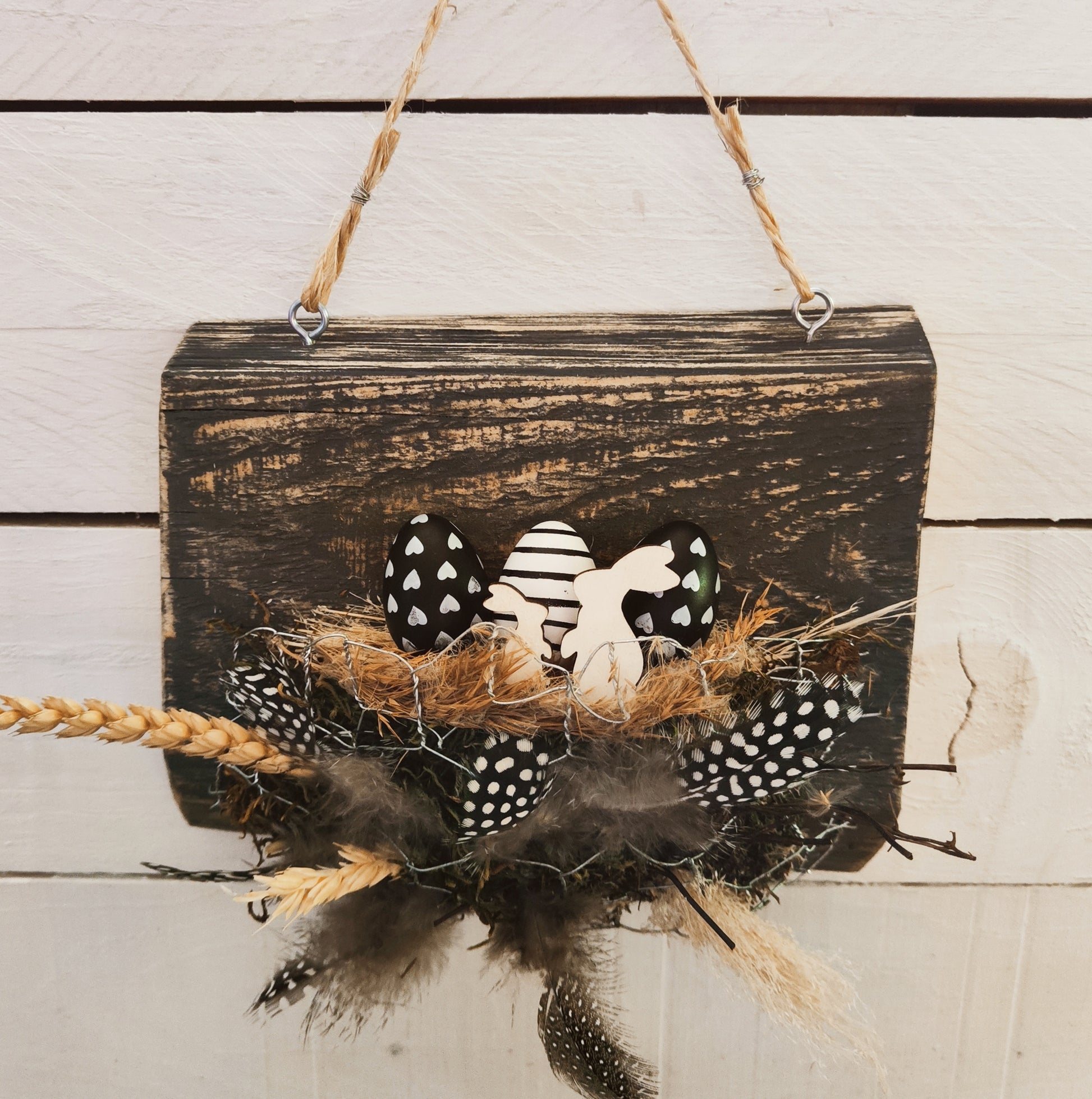 Osterschilder, Frühlingsschilder aus Holz. Das Holz ist geschliffen, lackiert, zum Teil gespachtelt, gewachst, wieder geschliffen. Hasendraht darauf befestigt, mit Moos befüllt und natürlich schön österlich, frühlingshaft dekoriert. Sehr schön für die Eingangstür in der Frühlingszeit.