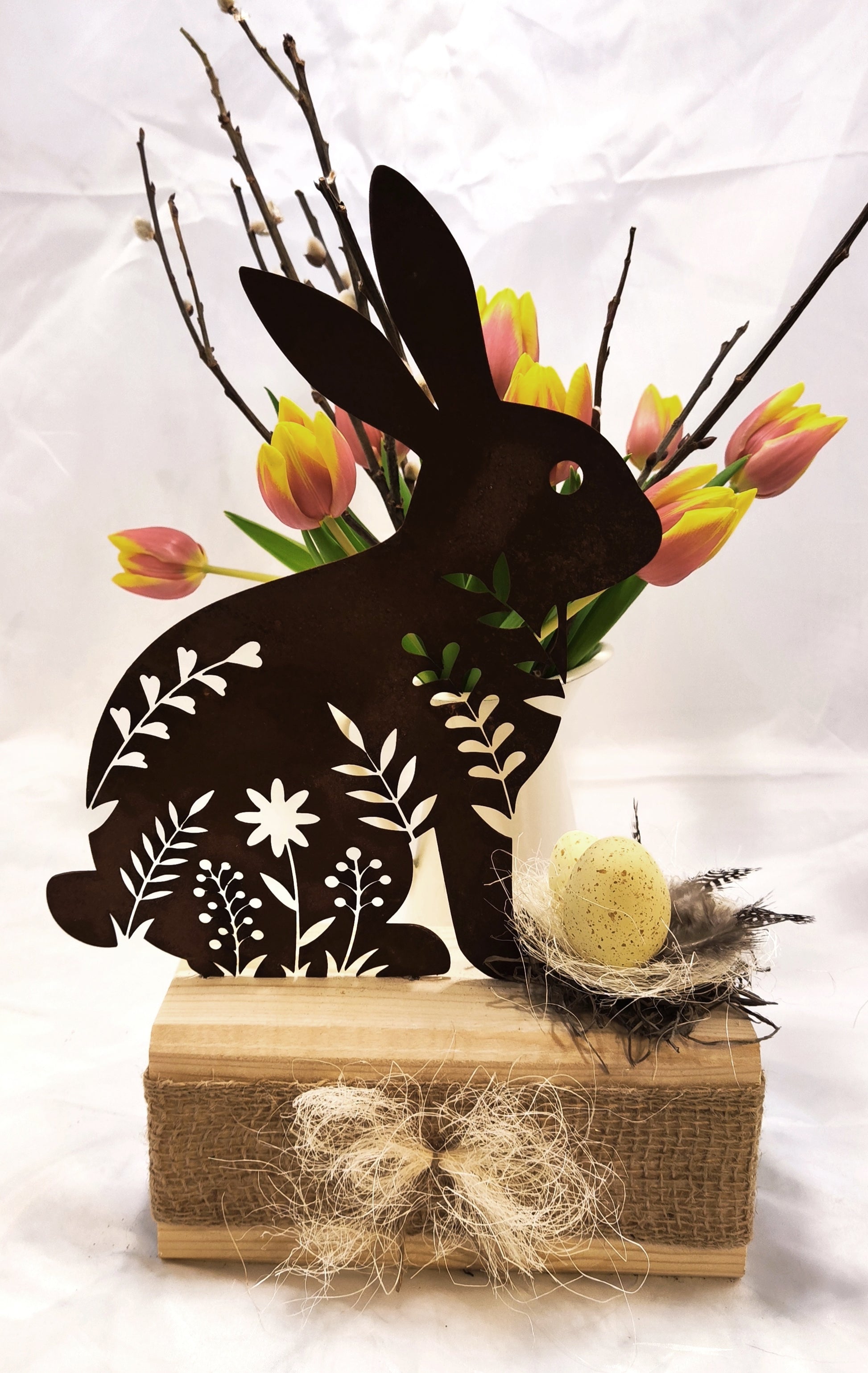 Toller filigraner Hase aus Stahl edelverrostet und frühlingshaft, österlich auf Holz dekoriert. Größe: H 36cm x B 26cm x T 9cm.