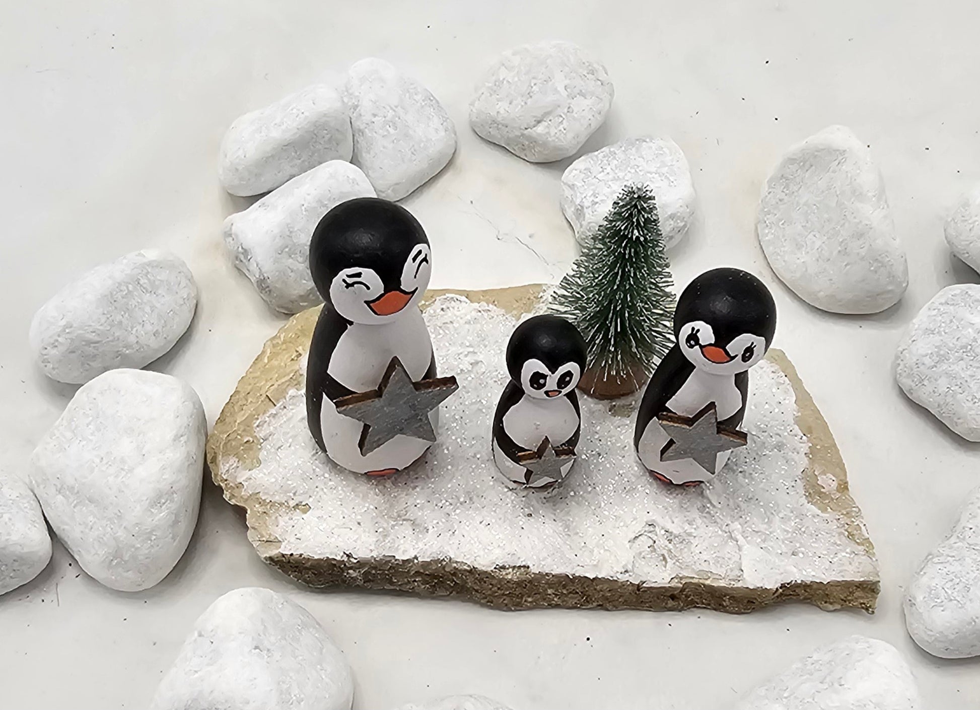 Zauberhafte kleine Pinguine, bemalt mit Acrylfarben, aus Holzkegel, mit kleinen Sternen und Bäumchen. Der Sandstein ist mit Strukturpaste behandelt.