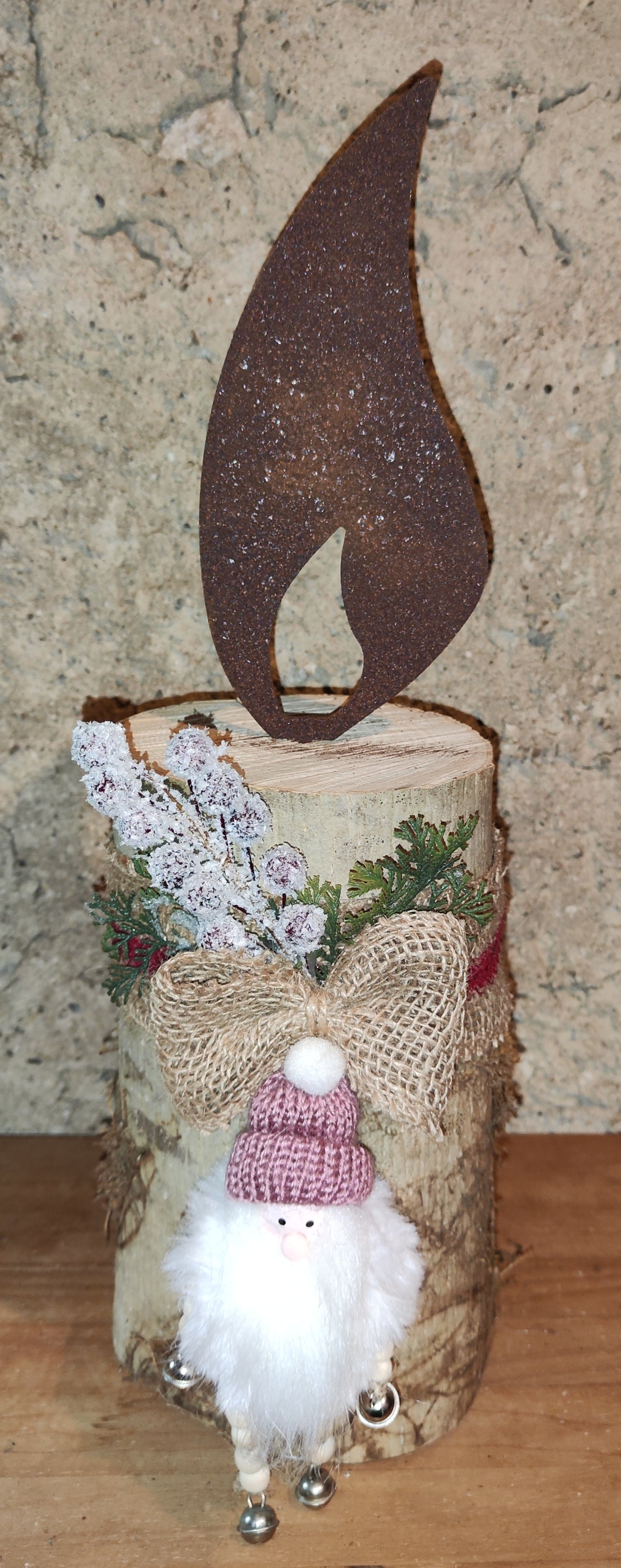 Flamme aus 2mm Stahl in Rostoptik. Weihnachtlich, winterlich dekoriert auf einem Baumstamm. Auch wunderschön als Dekoration im Hauseingangsbereich oder auf dem Balkon, der Terasse und im Garten.