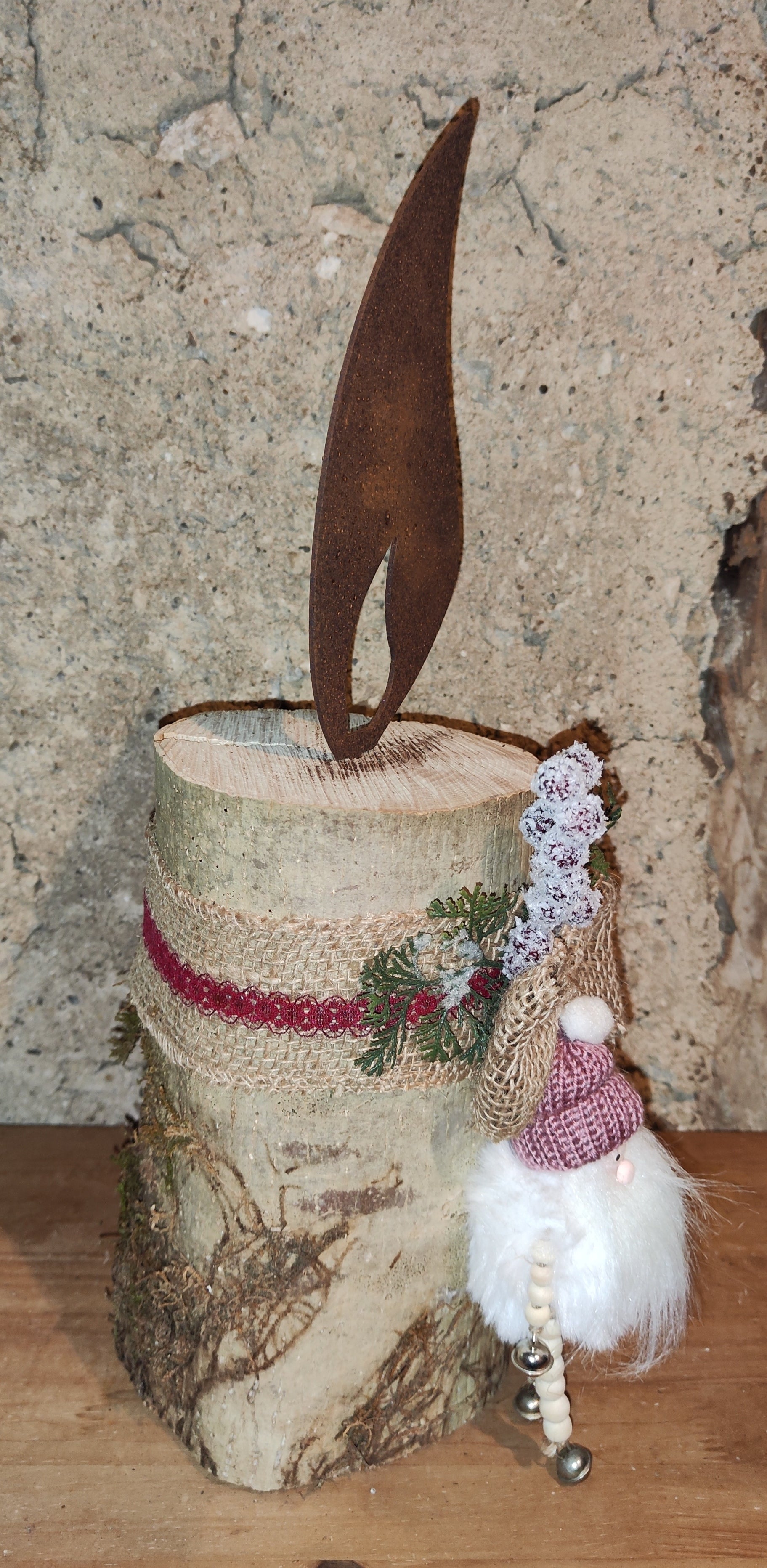 Rostkerze, Rostflamme, Edelrost Flamme in Rostoptik weihnachtlich, winterlich auf Baumstamm dekoriert, Weihnachten, Deko.