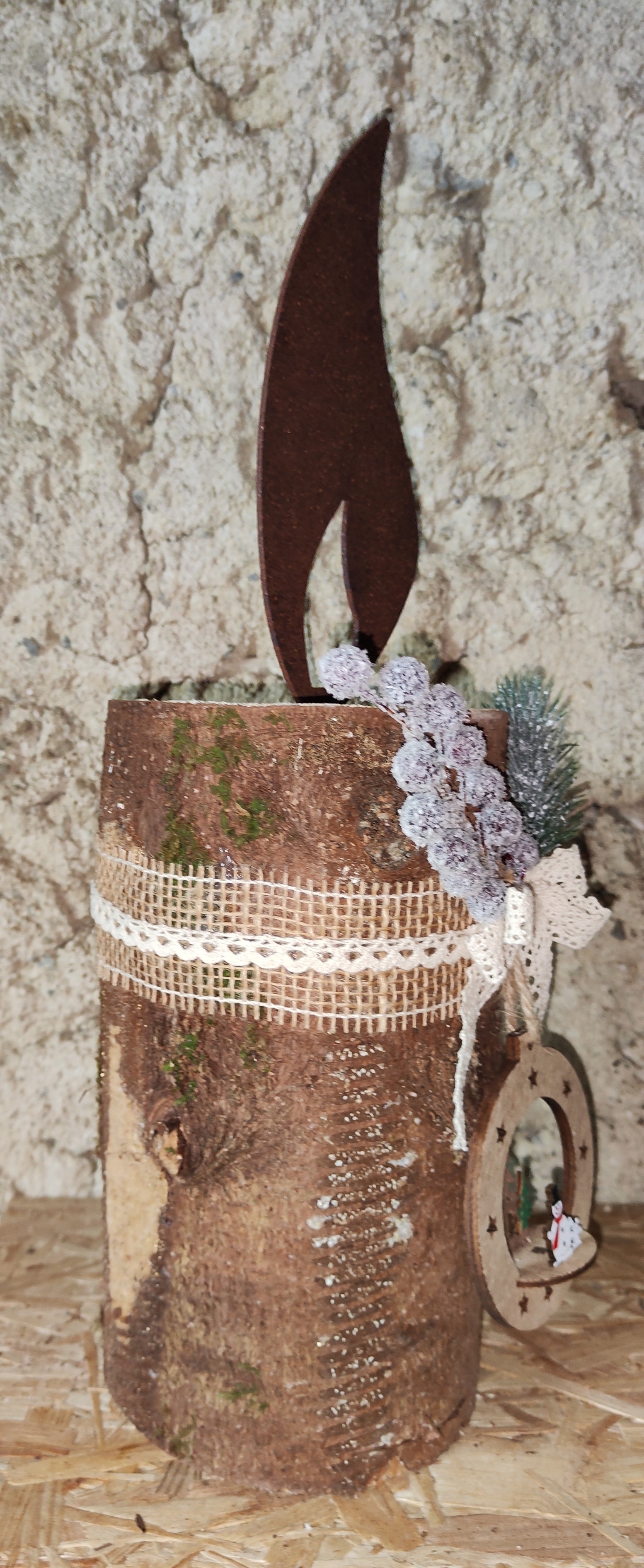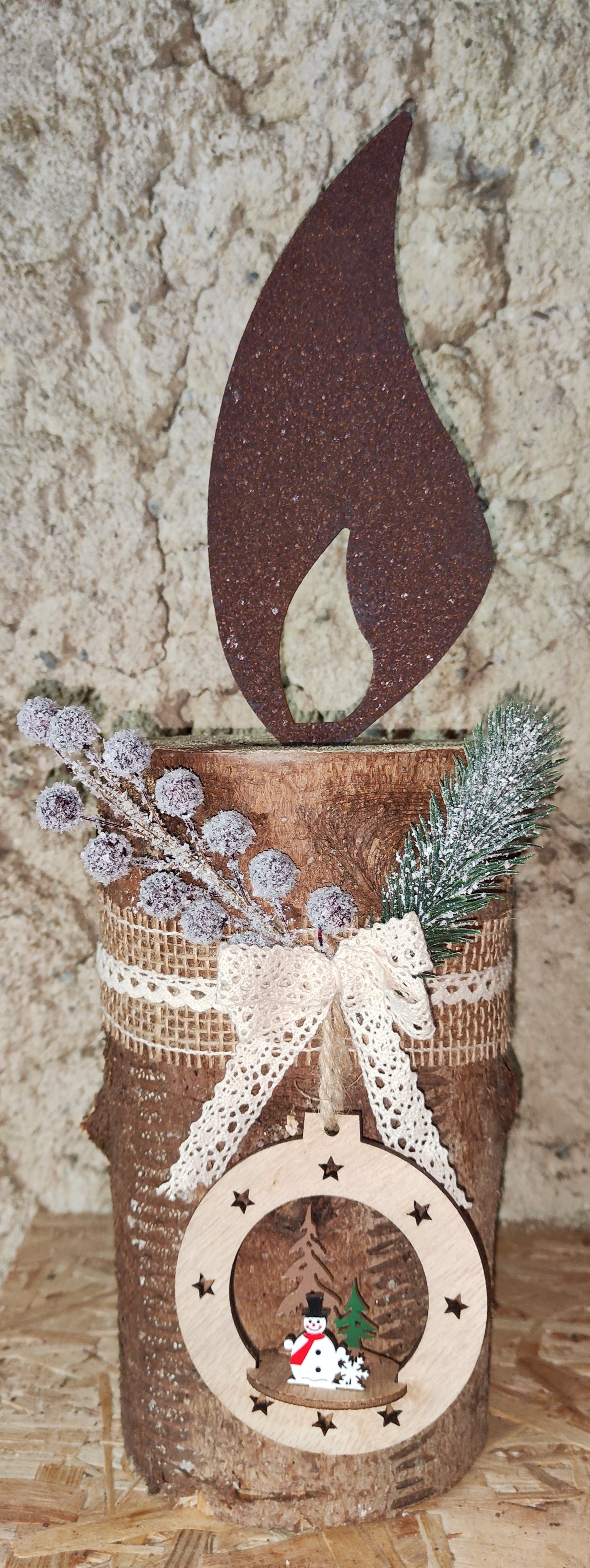 Rostkerze, Rostflamme, Edelrost Flamme in Rostoptik weihnachtlich, winterlich auf Baumstamm dekoriert, Weihnachten, Deko.