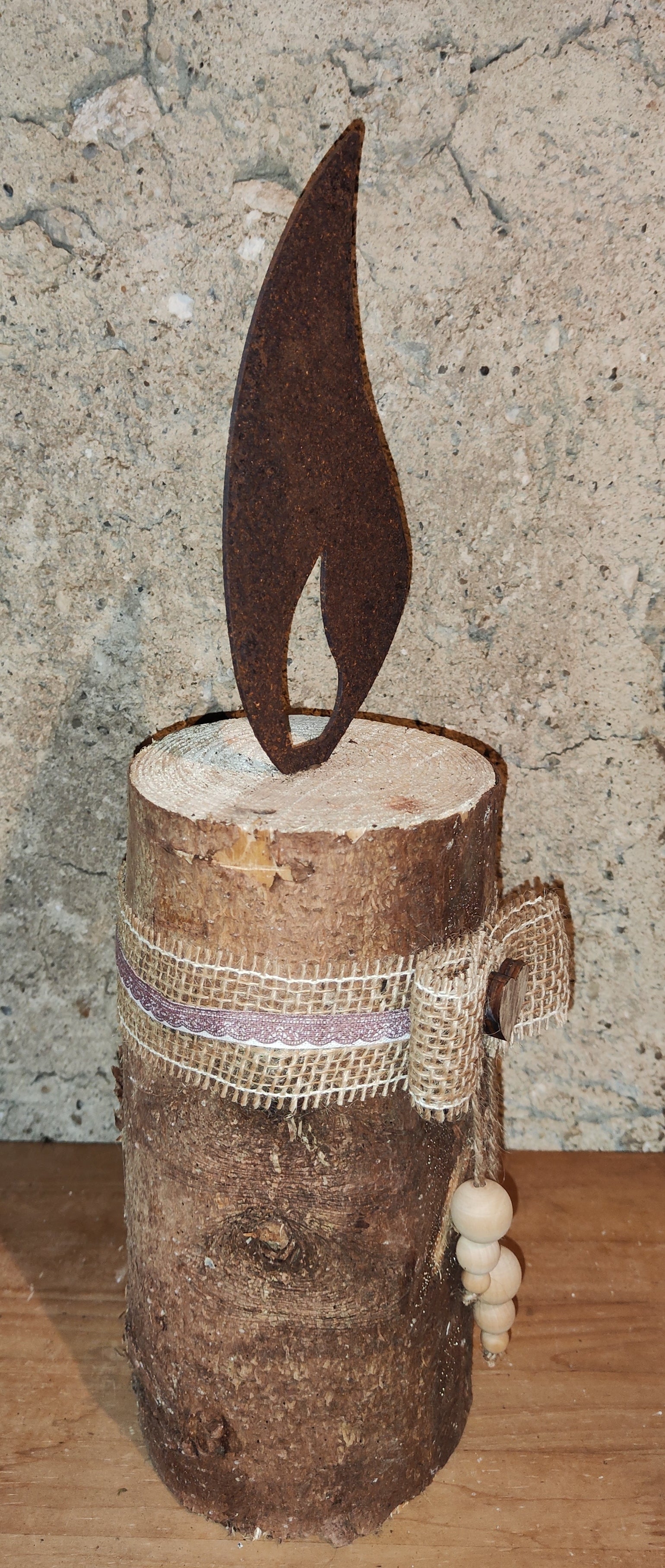 Rostkerze, Rostflamme, Edelrost Flamme in Rostoptik weihnachtlich, winterlich auf Baumstamm dekoriert, Weihnachten, Deko.