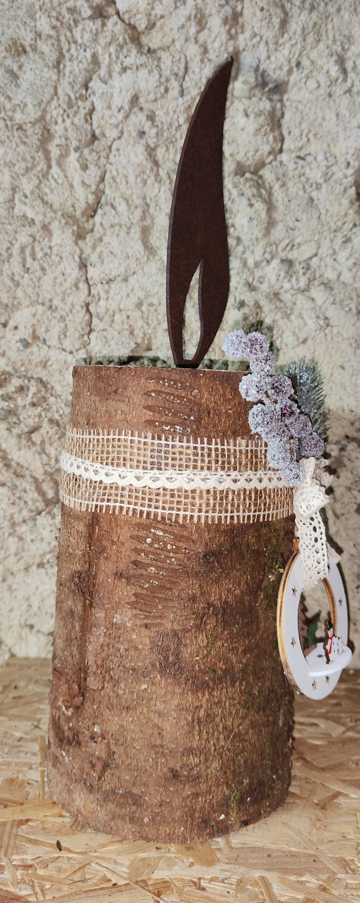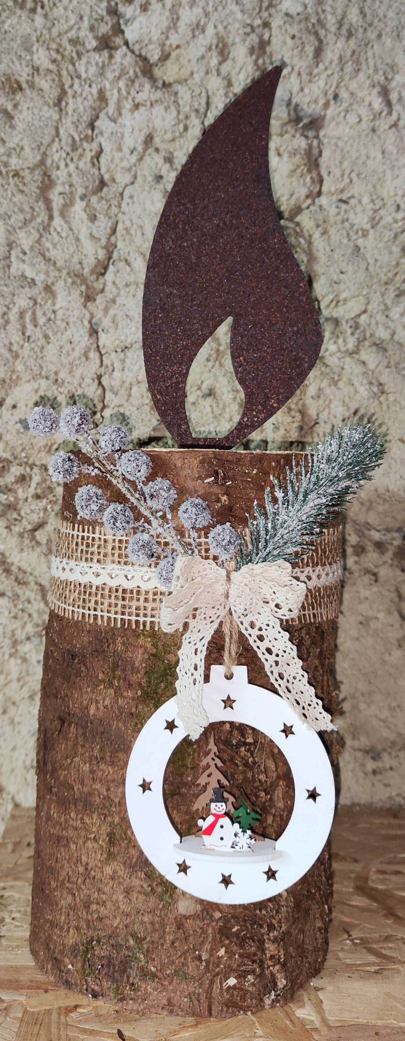 Rostkerze, Rostflamme, Edelrost Flamme in Rostoptik weihnachtlich, winterlich auf Baumstamm dekoriert, Weihnachten, Deko.