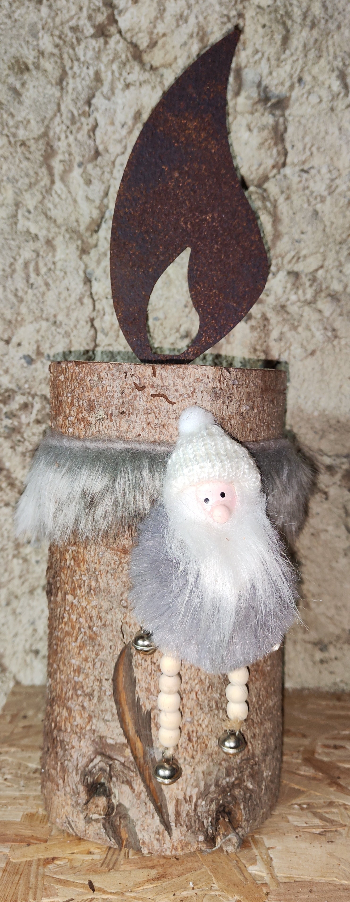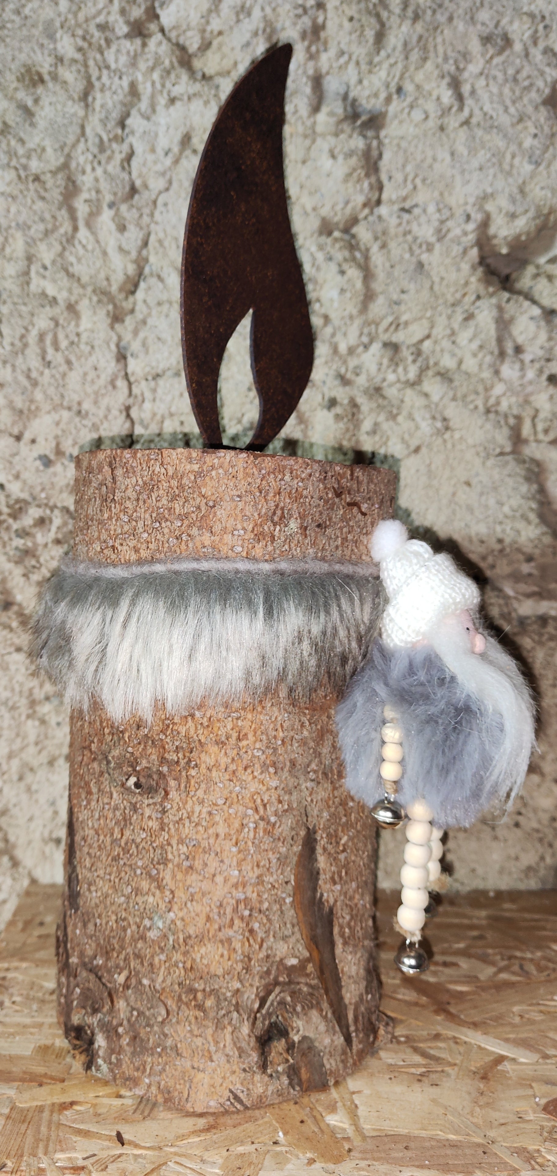 Rostkerze, Rostflamme, Edelrost Flamme in Rostoptik weihnachtlich, winterlich auf Baumstamm dekoriert, Weihnachten, Deko.
