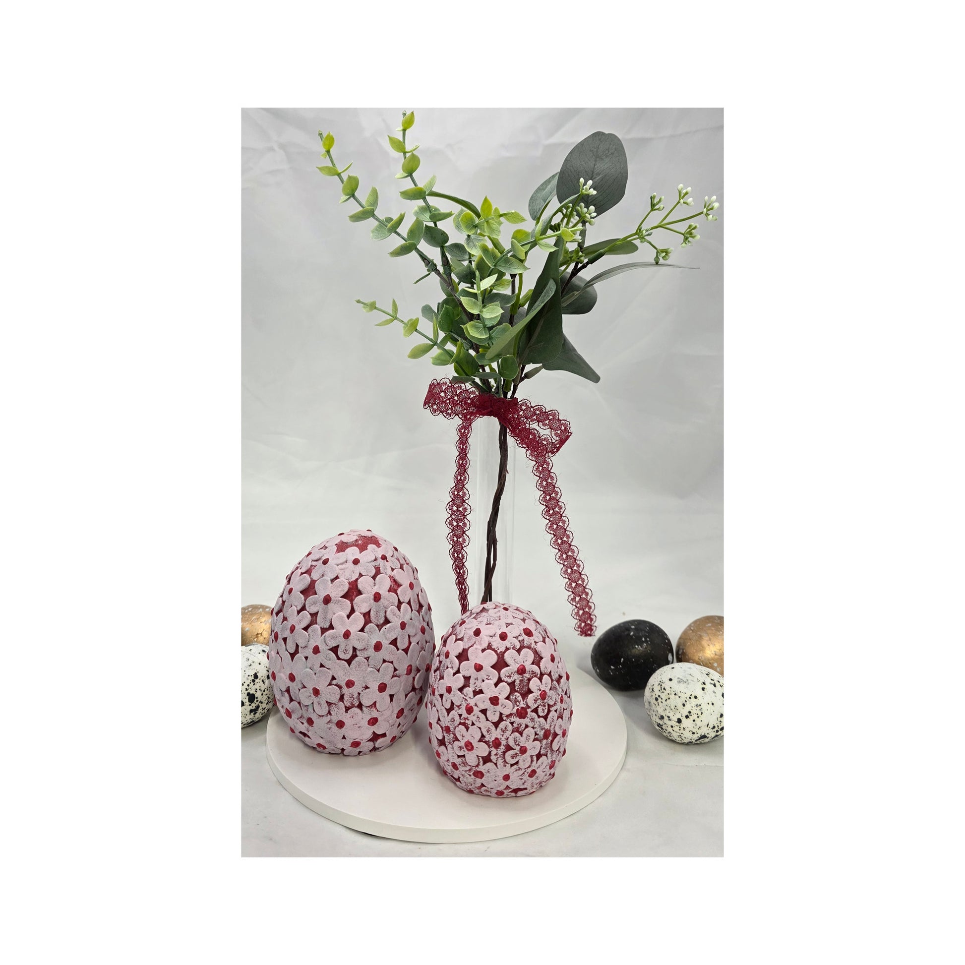 Schönes Geschenkset, bestehen aus einem Tablett, zwei handbemalten Eiern mit Blumen, einer Glasvase im Raysinständer und Kunstblumen.