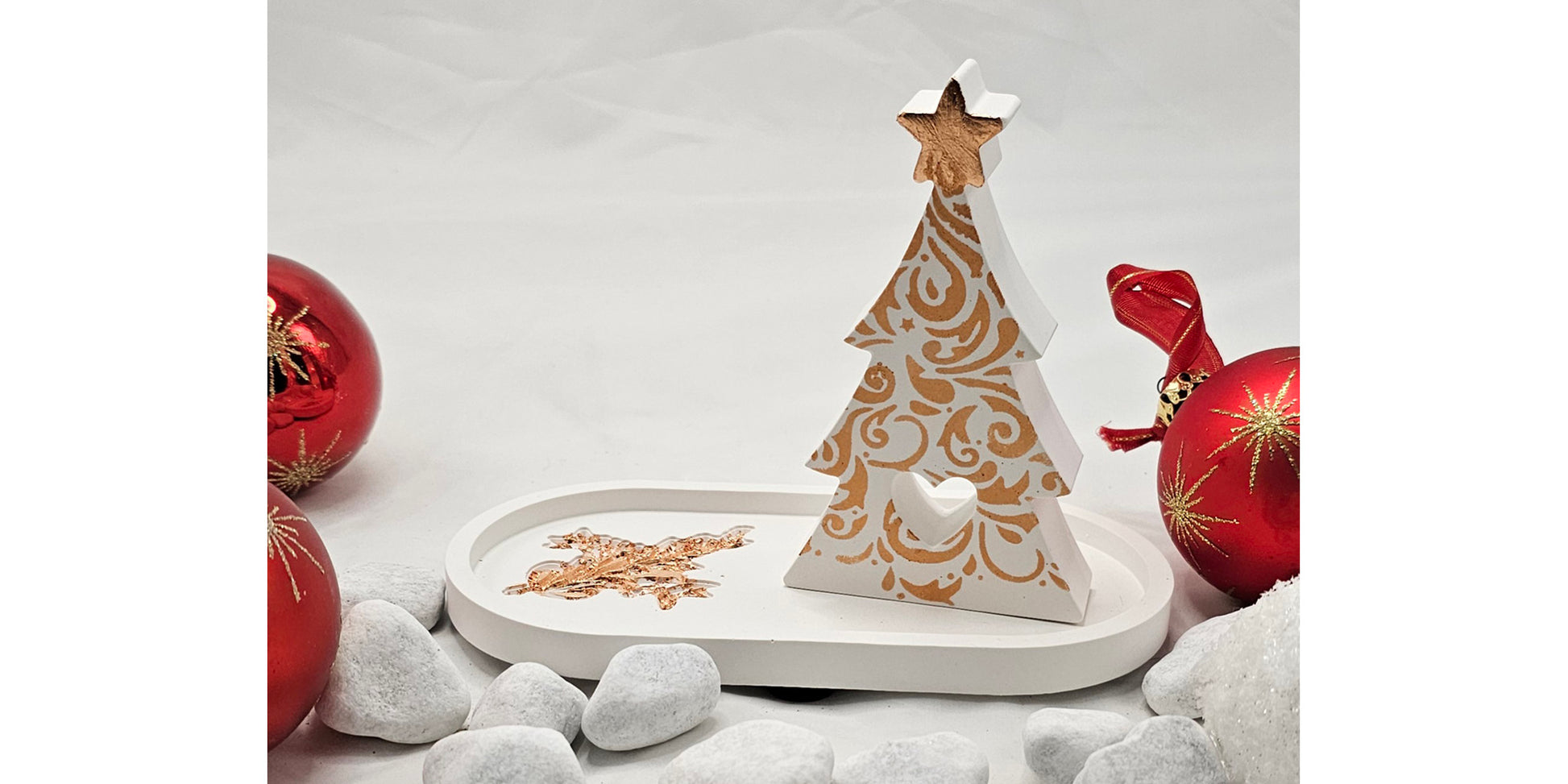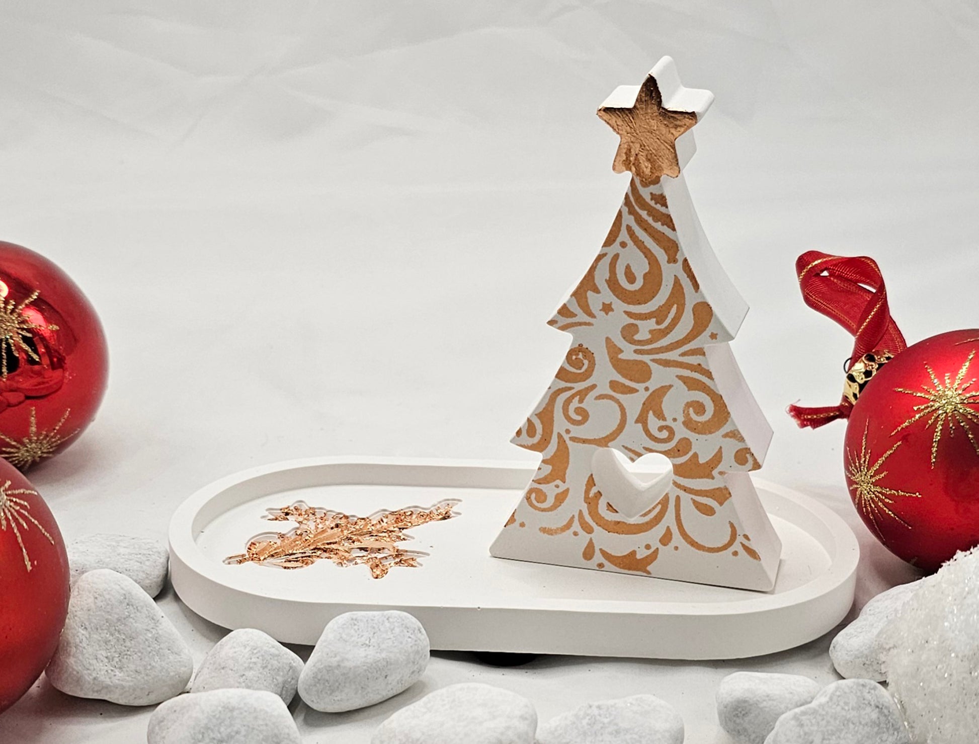 Geschenk-Set Tanne, mit Blattmetall und Acrylfarbe schabloniert, auf kleinem Tablett, ebenfalls mit Blattmetall bearbeitet. Beides aus Raysin gegossen und geschliffen.